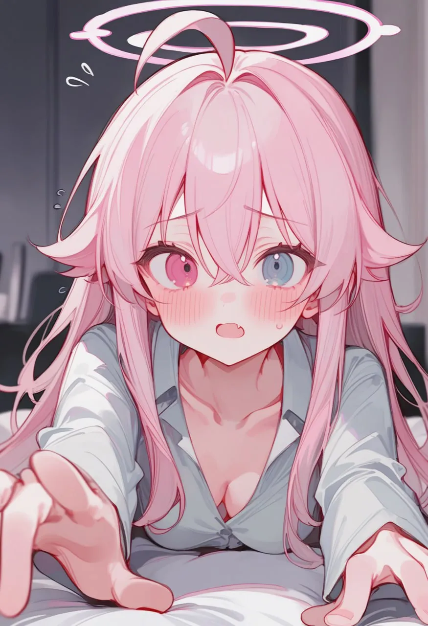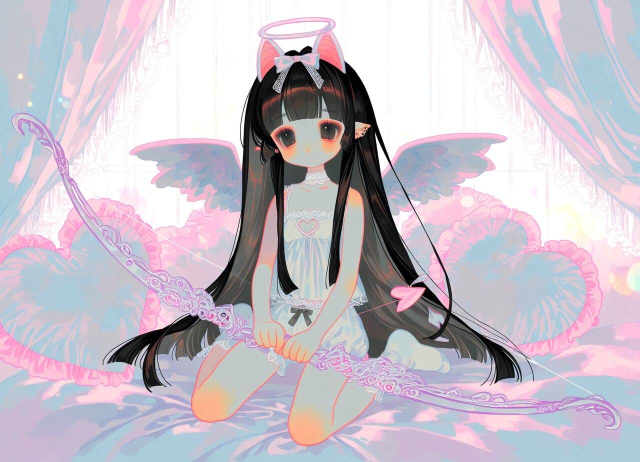 Одежда и остальное: white camisole,heart cutout,white bloomers,white winged socks,white lace choker,halo, tiny angel wings, pillows, (close up),bow \(weapon\), holding, holding bow \(weapon\), holding weapon, heart-themed bow