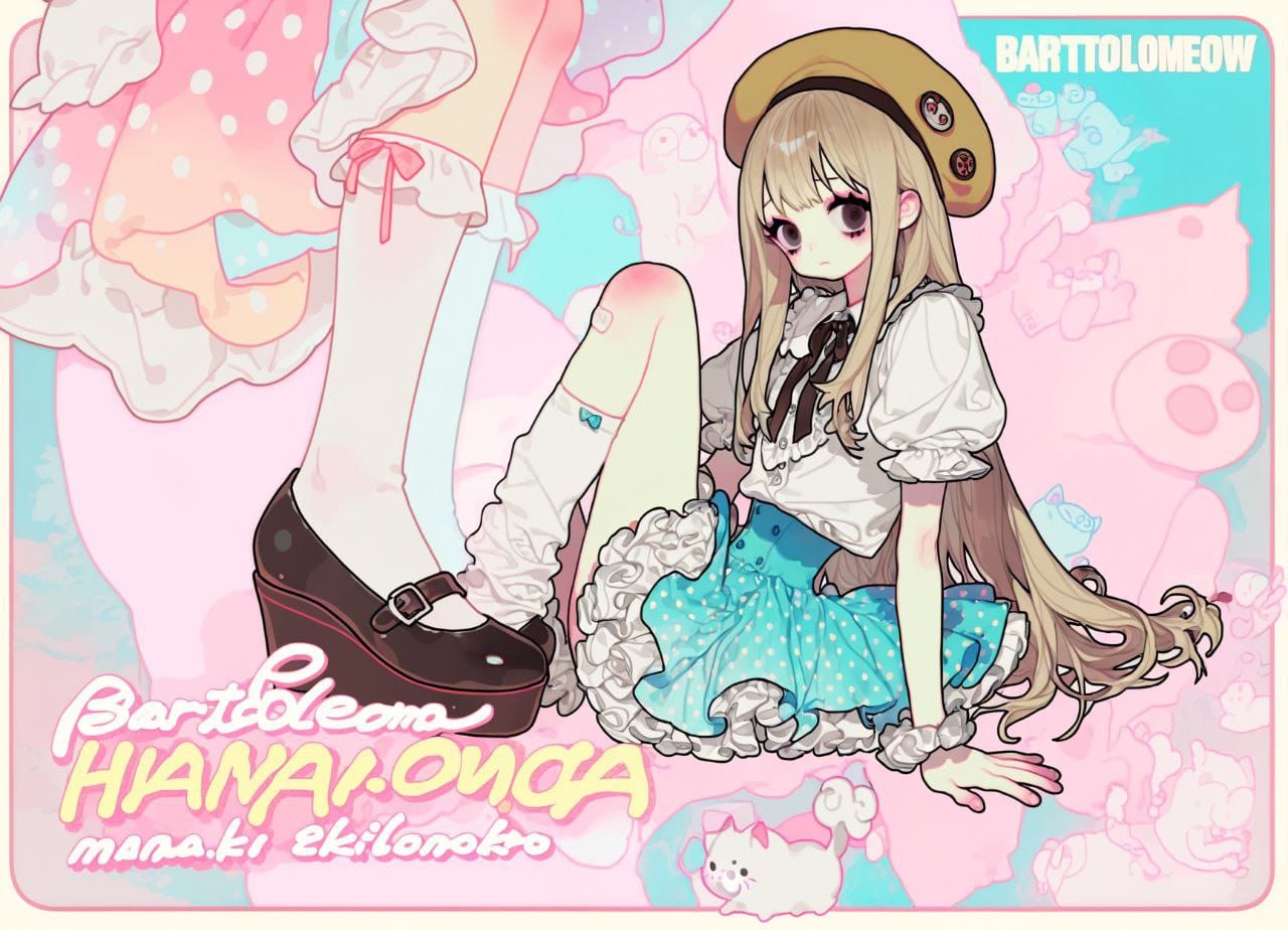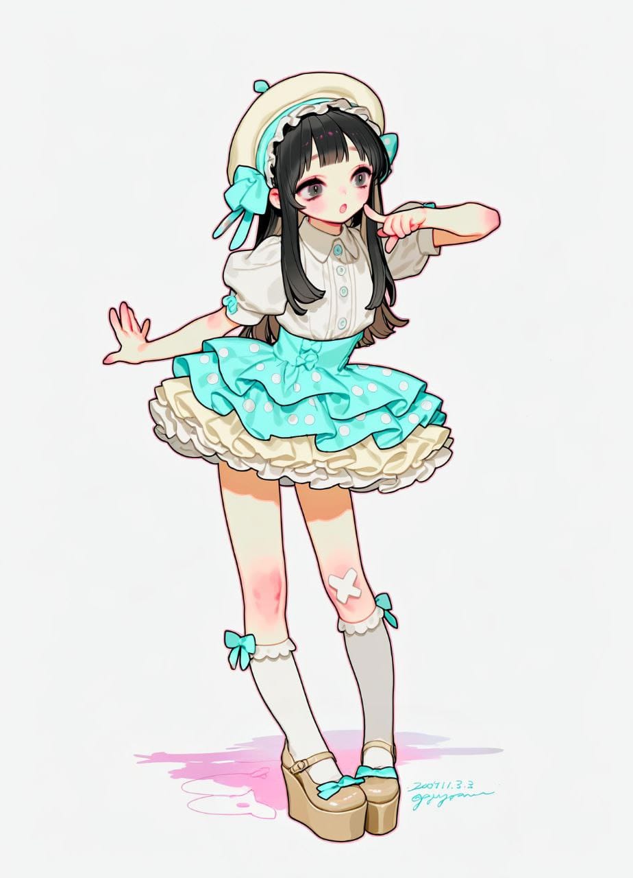 beret, light blue hat bow, polka dot skirt, light blue skirt, layered mini skirt, knee socks, ruffle knee socks, ruffle collared shirt, short puffy sleeves, white shirt, ((light brown platform mary janes)),wedge heels