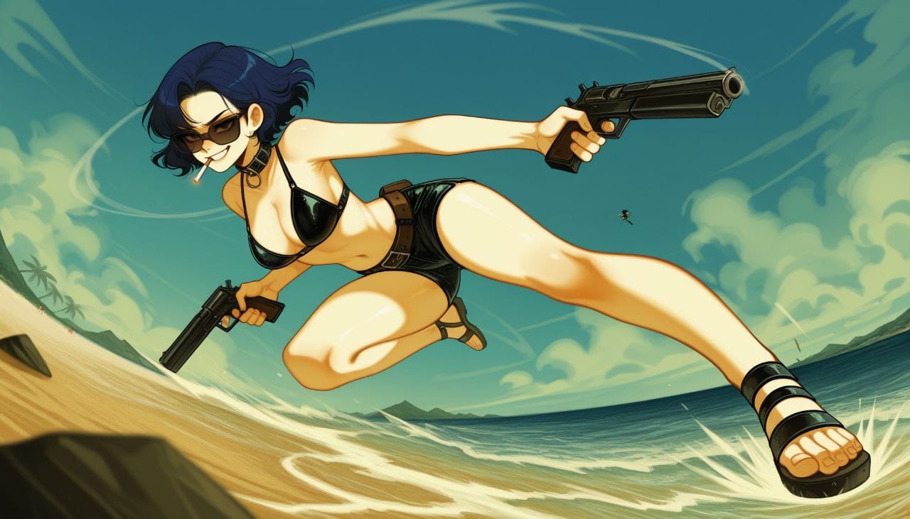 holding gun, dual wielding, gun akimbo, full body, action pose, action running pose, perspective