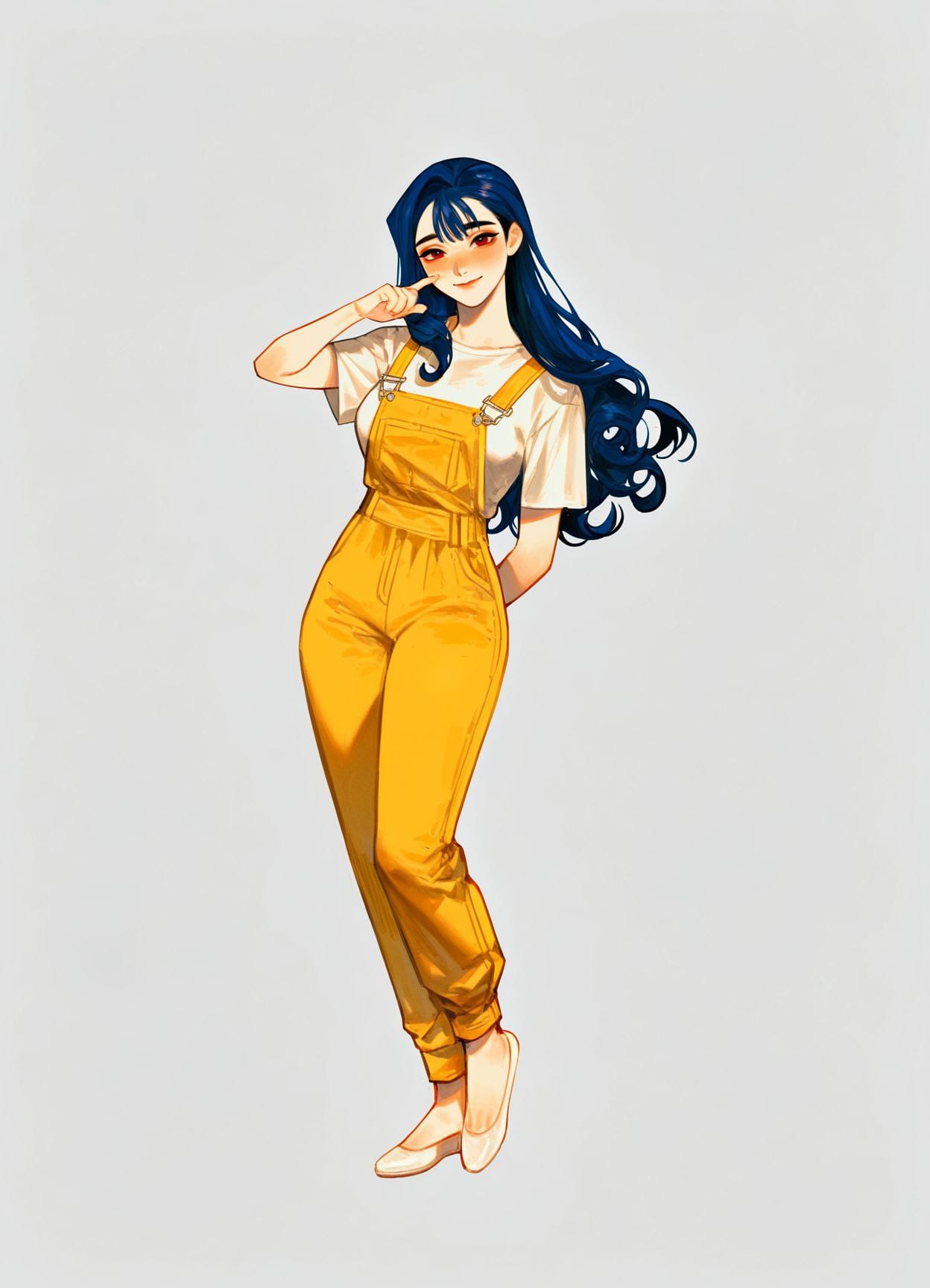 smiles, looks at viewer, closed smile, finger on cheek, one hand behind back, standing on toes
