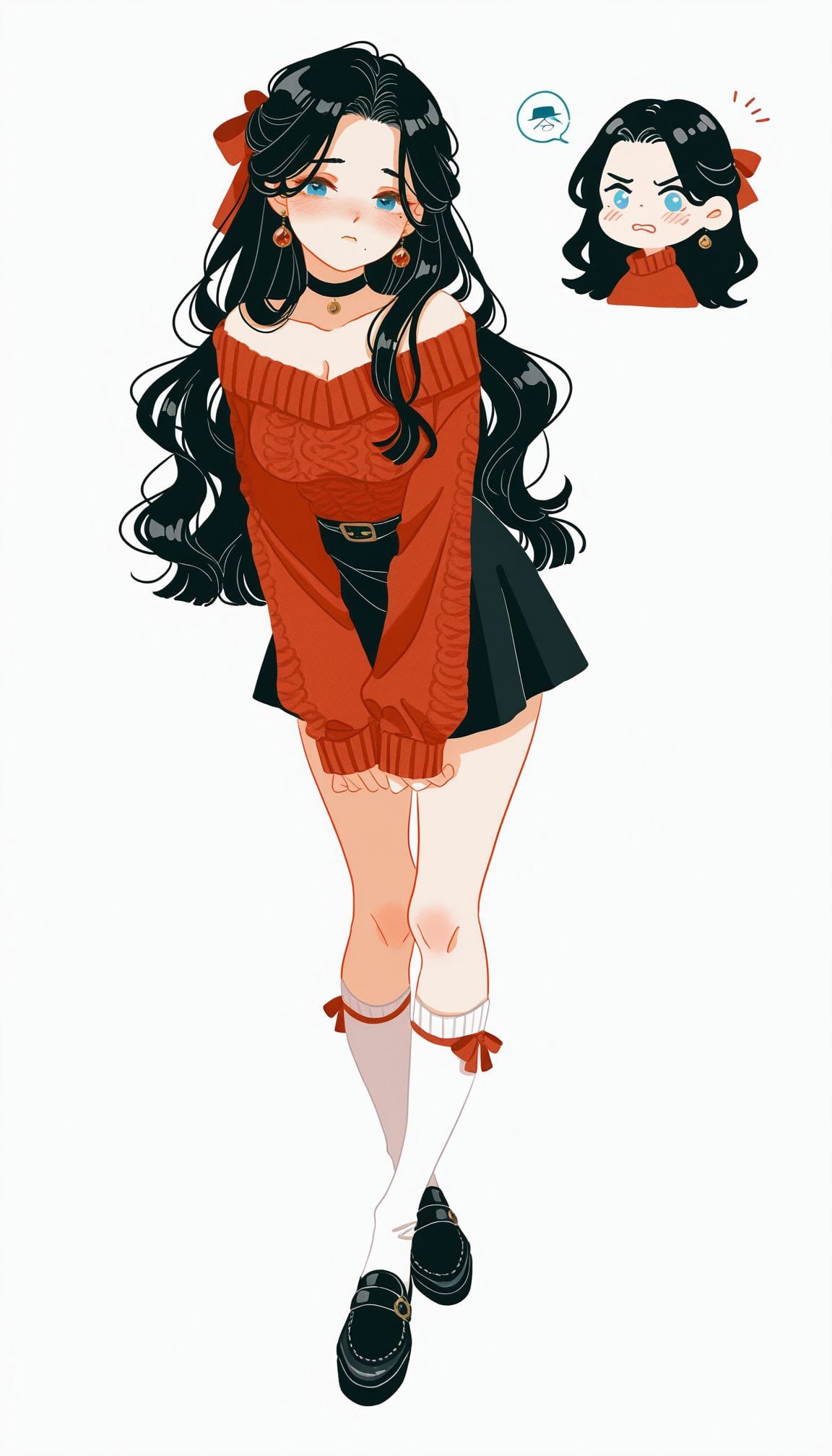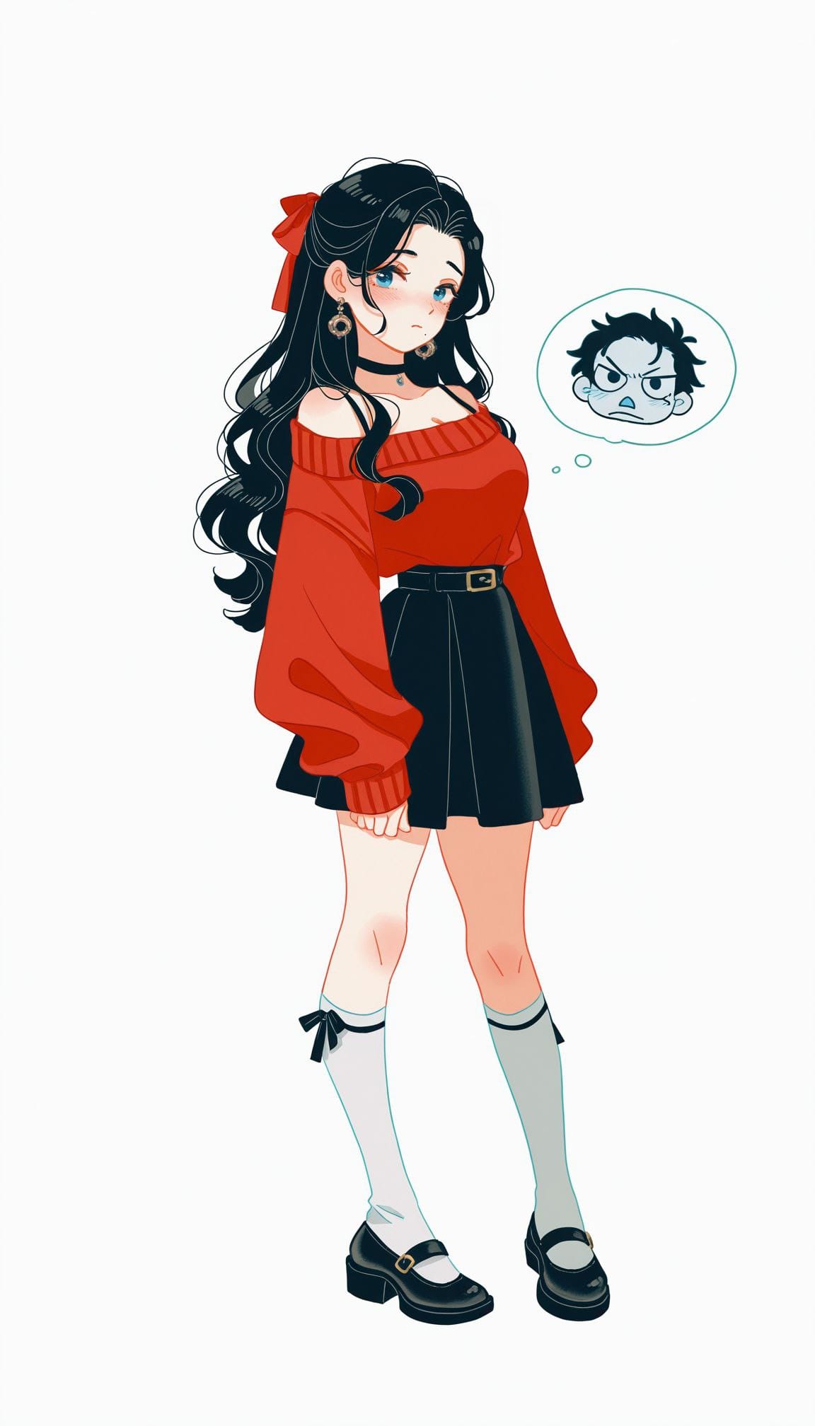 (red sweater), open shoulders, choker, black skirt, white knee socks, black flat shoes