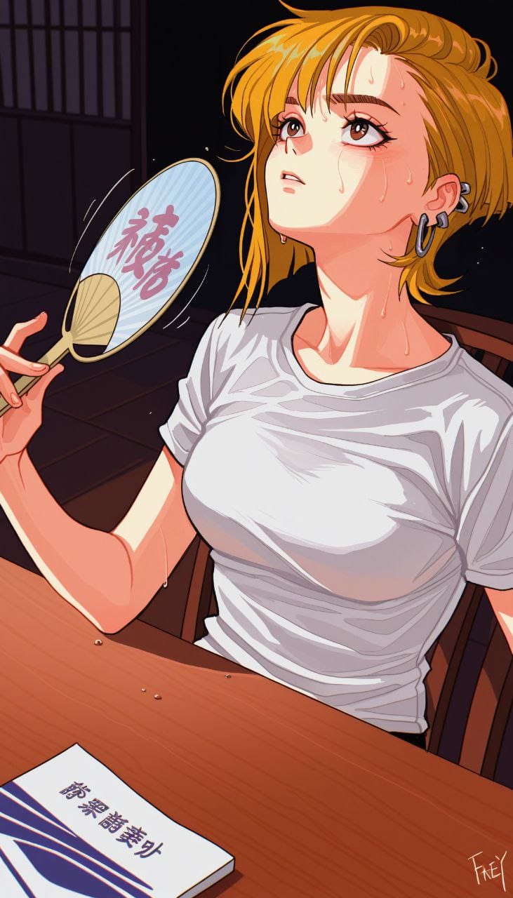 sweating, holding fan, waving fan, sitting at table, leaning back on back of chair, head slightly up, looking up, motion lines