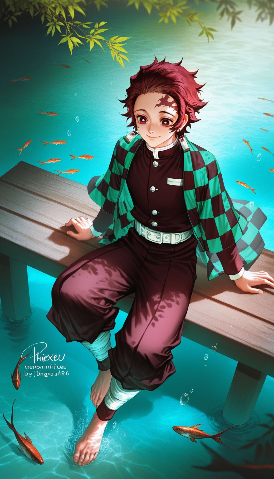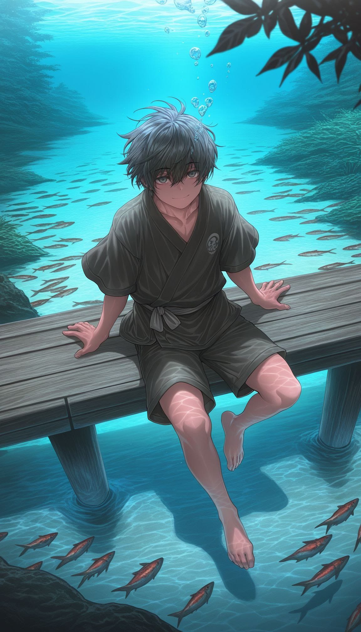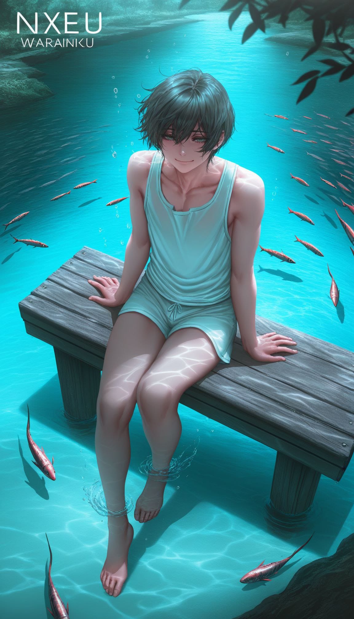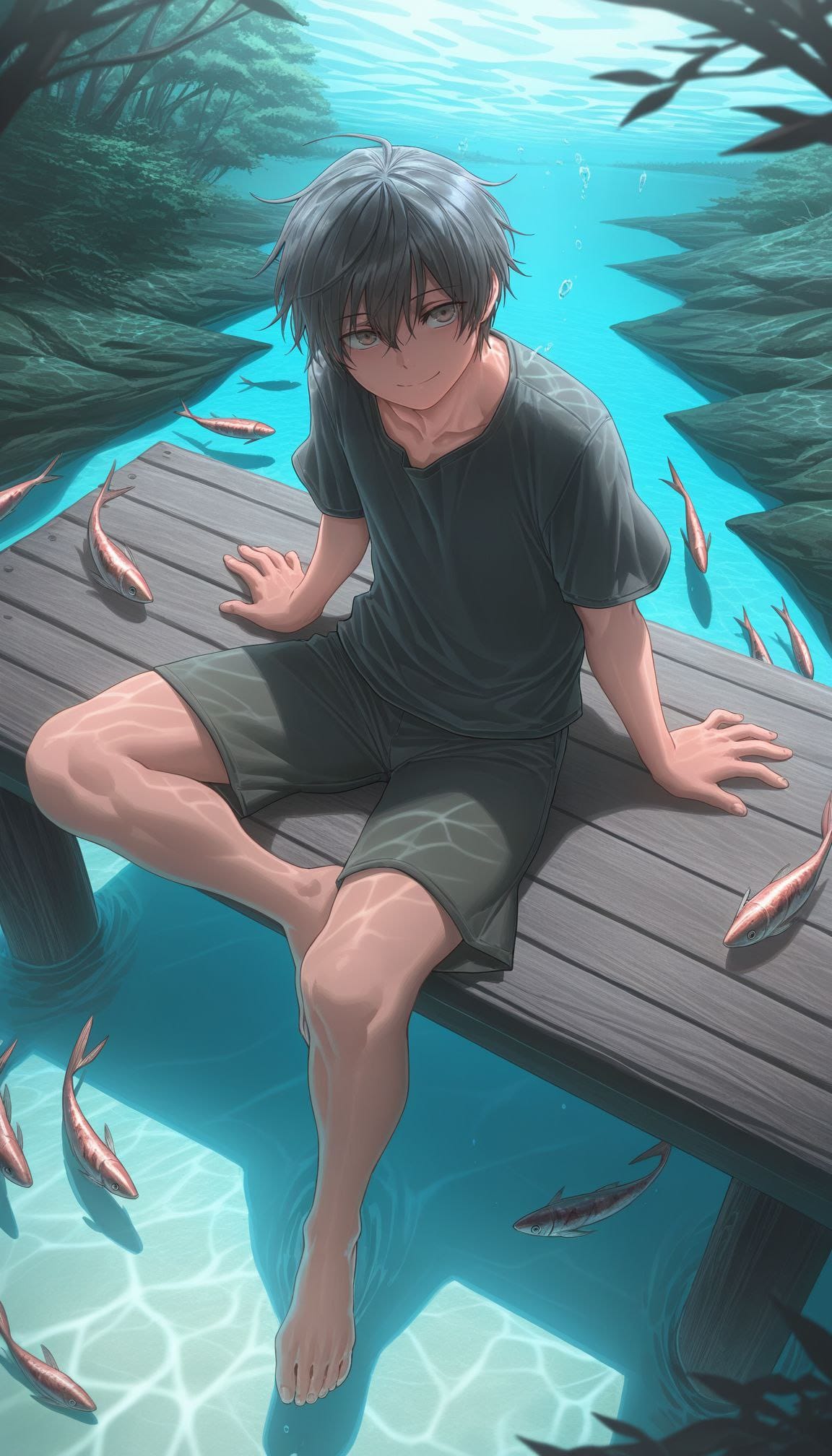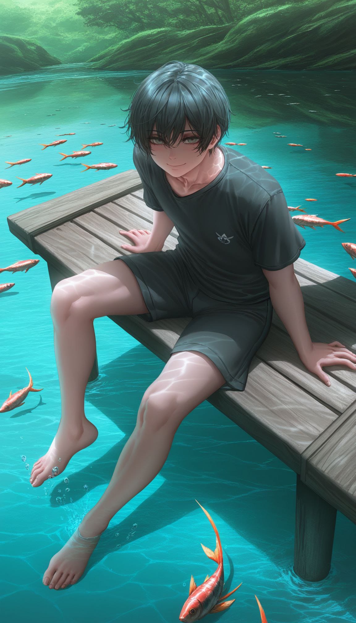 sitting on pier, barefoot, feet in water, from above,full body,nature, spring, multiple fish