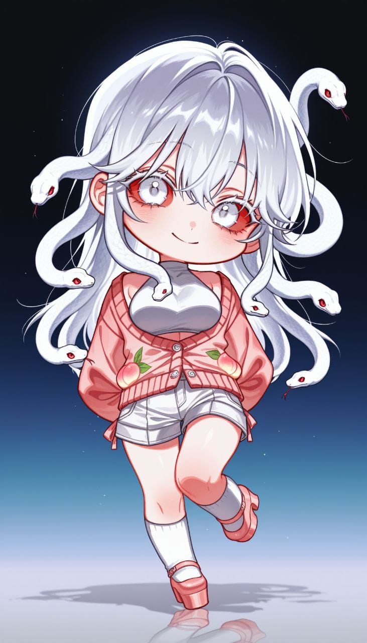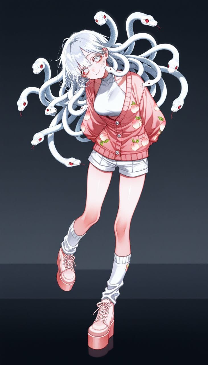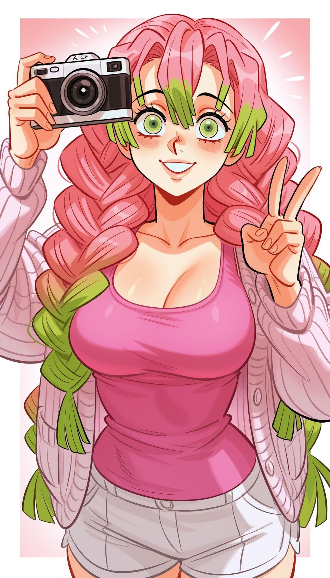 white halterneck top, white shorts, cargo shorts, shorts twist, (pale pink cardigan, large buttons, white buttons), puffy sleeves, (peach print), white knee socks, (pale pink pumps, footwear, platform footwea)