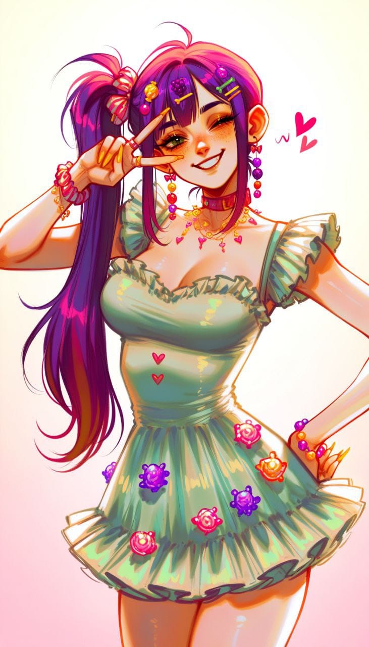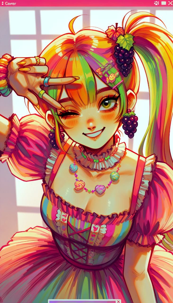 1girl, medium breasts, grape-colored hair, long hair, side ponytail, split bangs, puffy dress, short dress, multiple ruffles, candy decorations, candy-shaped hairpins, candy-shaped earrings, decora outfit style, green eyes, rings, rings shaped like candies, yellow nails, long nails, looks at the viewer, smiles, from above, winks, one eye closed, v, v over eye, upper body, action pose, start \(symbol\), window \(computing\)