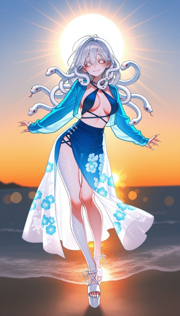 blue bikini, sling bikini top, multi-strapped bikini top, multi-strapped bikini bott, blue midriff skirt, semi-transparent skirt, floral print skirt, blue cardigan, translucent cardigan, cropped cardigan, white sandals, high platform sandals