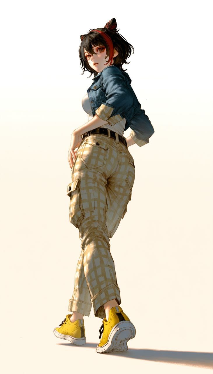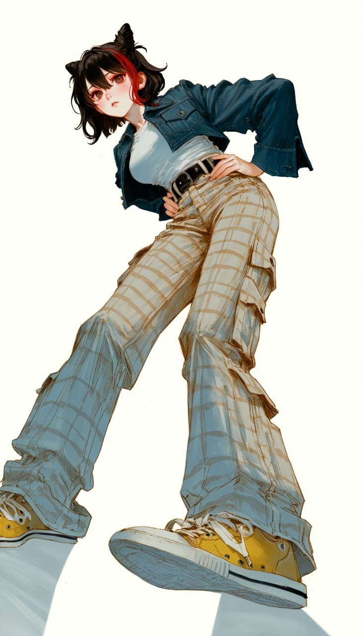 white t-shirt, denim jacket, cropped jacket, black belt, beige pants, cargo pants, (beige tartan print pants:1.3), yellow sneakers