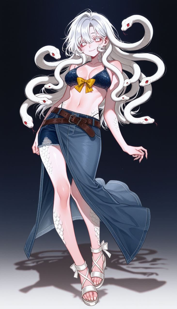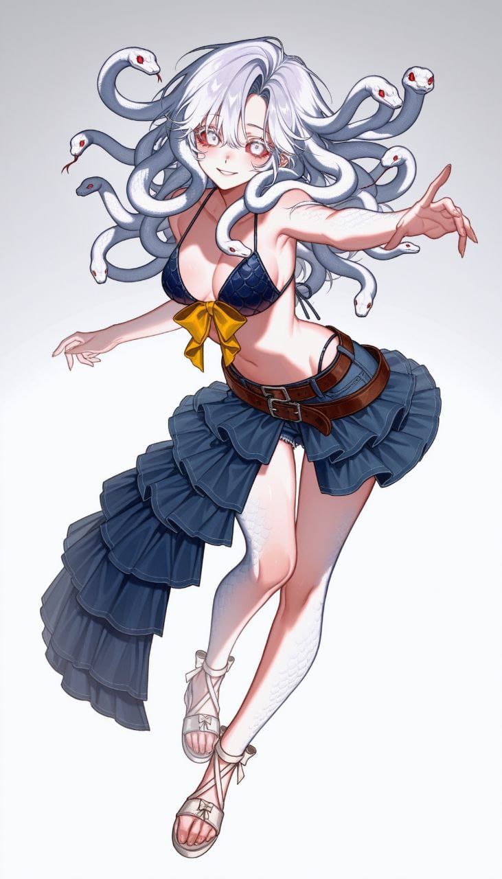 dark blue denim bikini, leather belts, brown belts, crossed belts, multiple belts, denim skirt, ((ruffles skirt)), (asymmetrical skirt), dark blue skirt, yellow bow, yellow bow, bikini strap, white sandals, heeled sandals, cross-tie sandals