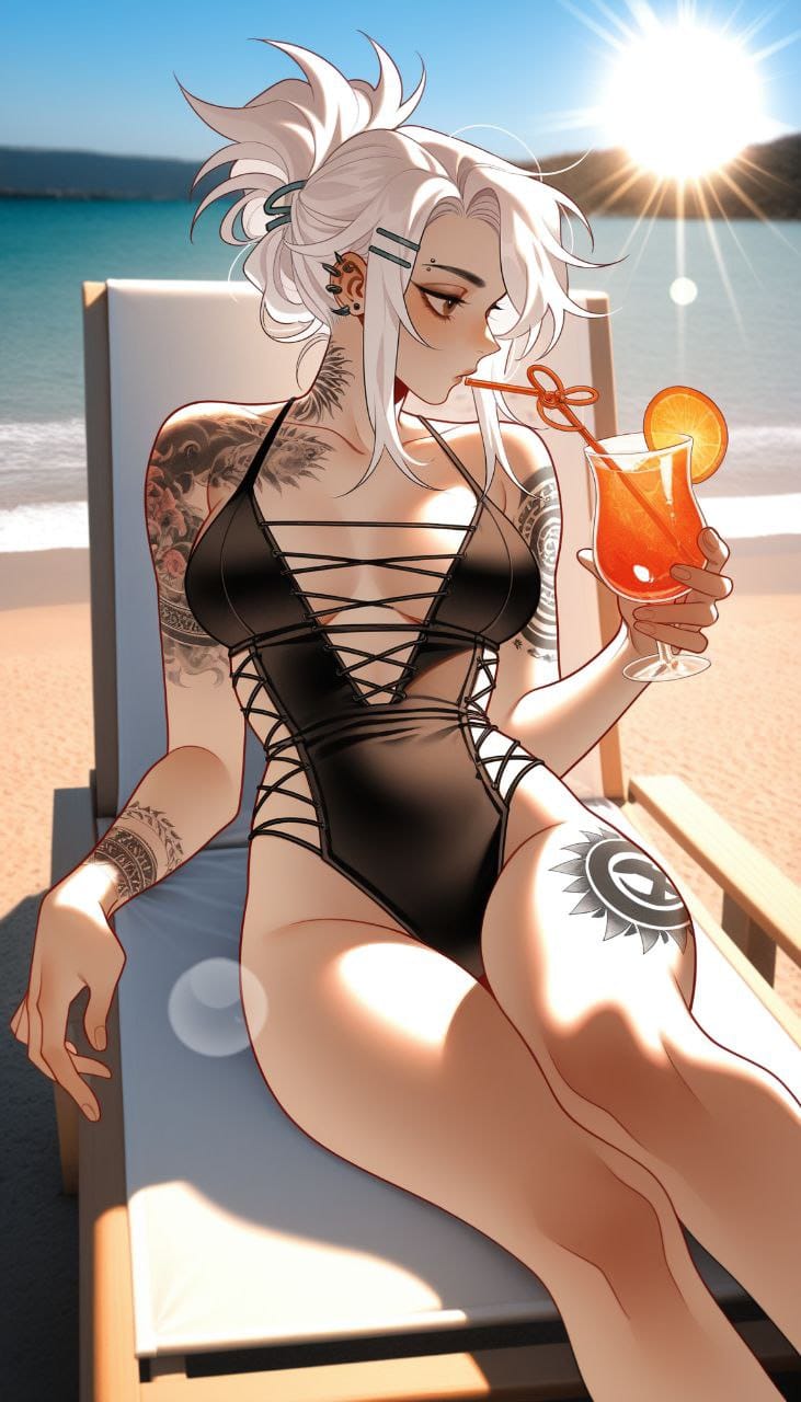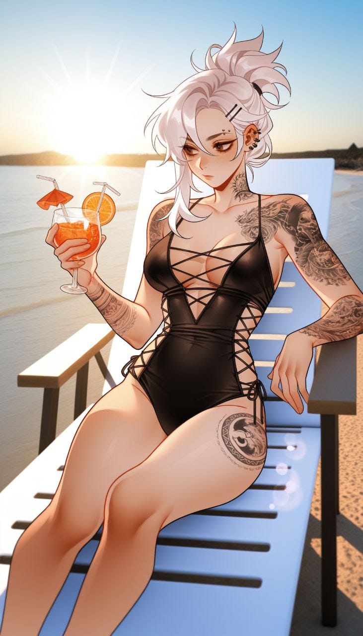 lying on lounge chair, holding cocktail, straw in cocktail, drinks cocktail through straw, looks away, photo background, photo realistic background, beach background, sunlight, warm colors, sun rays, bokeh, day, depth of field, lens flare, light, sun, sunlight