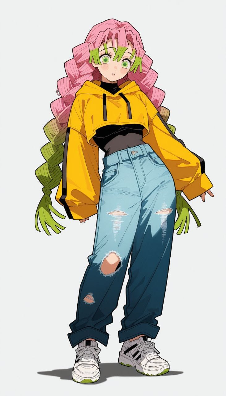 yellow hoodie, wide sleeves, black ribbons on the sleeves, cropped hoodie, black bodysuit, blue jeans wide jeans, ripped jeans, flared jeans, white sneakers, high-soled sneakers