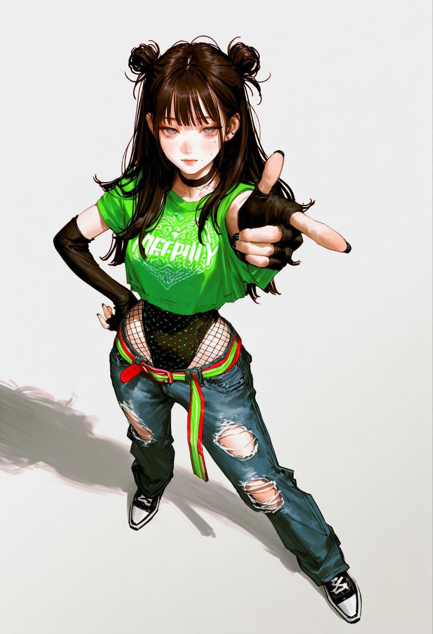black leotard, fishnet leotard, leotard under clothes, neon green crop shirt overhang, denim jeans, ((torn jeans)), (oversized jeans:1.5), black sneakers, black elbow-length gloves, fingerless gloves, belt, multicolored belt, print crop shirt overhang