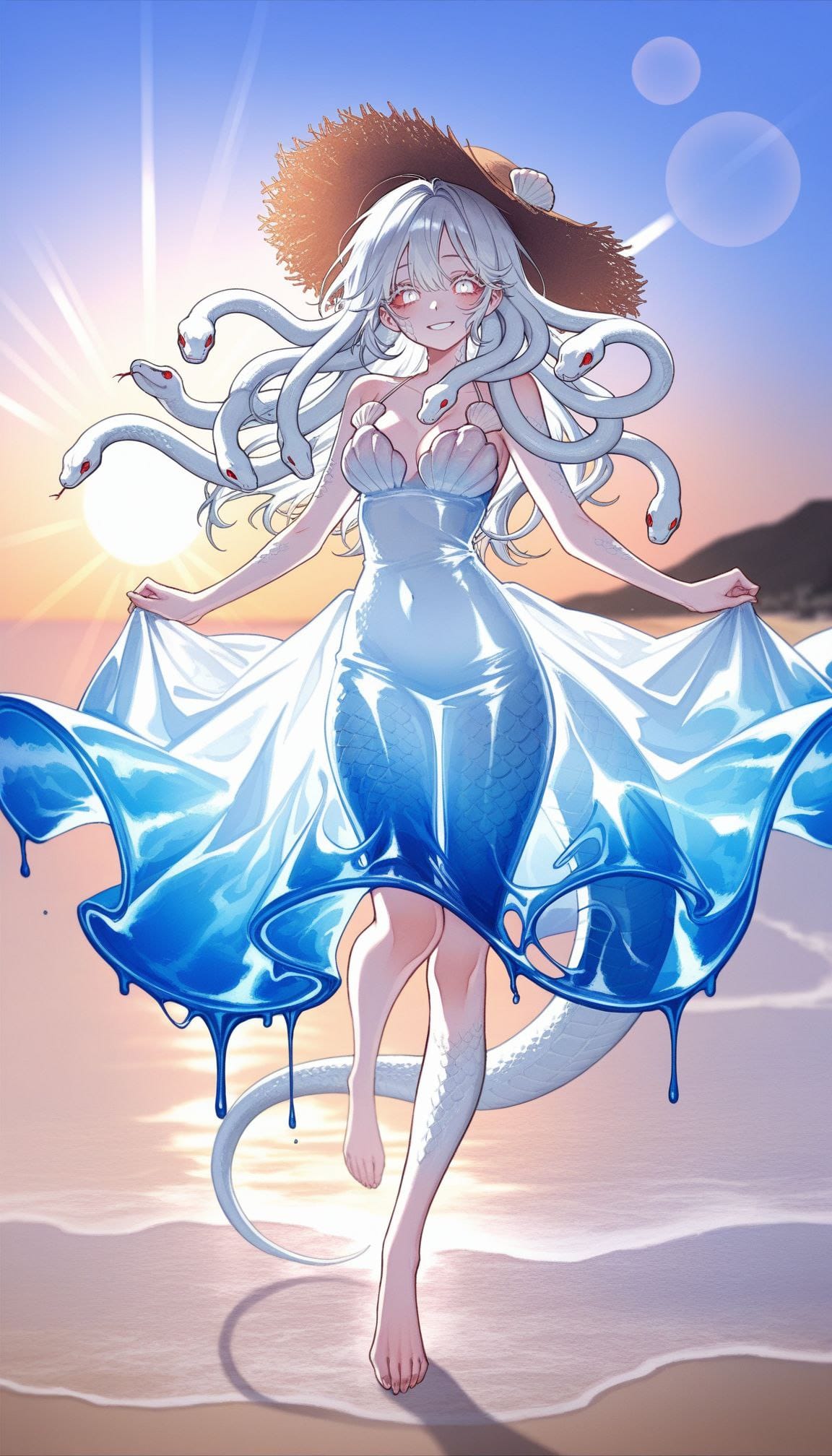 straw hat, white dress, (transparent dress:1.5), (liquid clothes, liquid dress:1.5),((gradient dress, blue dress, white dress))