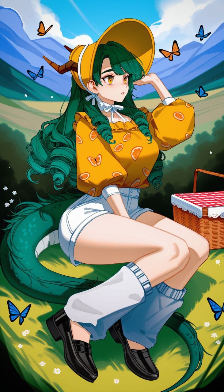 yellow shirt, puffed sleeves, ruffled shirt, white collar shirt, clothing print, orange slice print, white shorts, cargo shorts, white leg warmers, black flat shoes