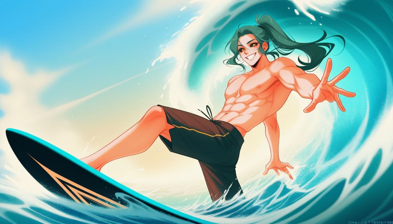 surfing, standing on a surfboard, wave, surf on a wave, sea, waves, summer, action surf pose, splashing water, perspective, full body