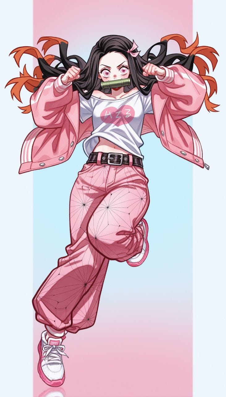 oversize t-shirt, white hip belt, top, white oversize t-shirt, off-shoulder t-shirt, pink jacket, oversize jacket, off-shoulder jacket, unbuttoned jacket, long trousers, pink trousers, oversize trousers, white sneakers, ((pink stripe print sneakers))