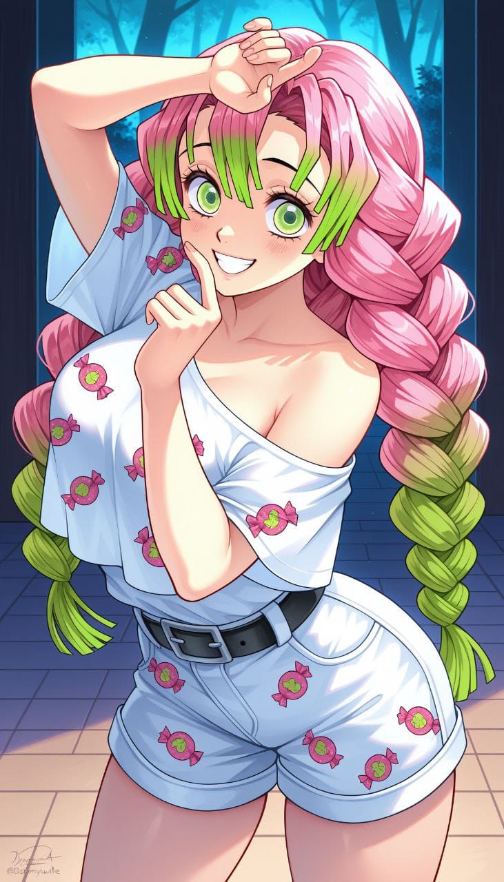 white blouse, open shoulders/one one shoulder, print, candy print, black belt, white shorts, cargo shorts