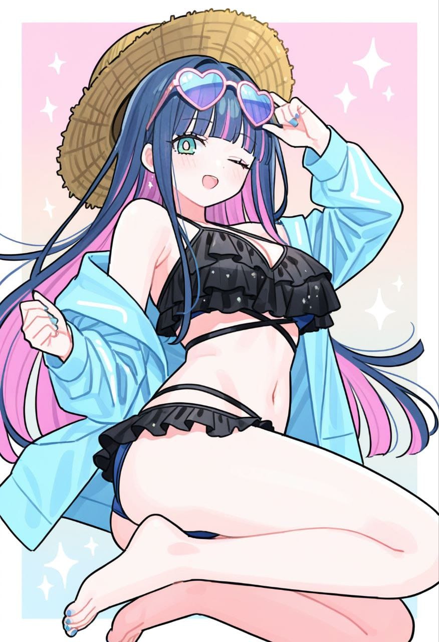 1girl, stocking (psg), solo, ;o, adjusting eyewear, ass, bare shoulders, barefoot, bikini, black bikini, blue-tinted eyewear, blue background, blue bikini, blue jacket, blue nails, blush, border, breasts, bright pupils, eyewear lift, eyewear on head, feet, fingernails, frilled bikini, frills, glitter, gradient-tinted eyewear, gradient background, heart, heart-shaped eyewear, jacket partially removed, large breasts, long sleeves, look at viewer, look to the side, nail polish, navel, off shoulder, one eye closed, open jacket, open mouth, open shirt, outside border, pink background, purple shirt, sparkle, star \(symbol\), stomach, straw hat, sunglasses, swimsuit, thighs, tinted eyewear, white border