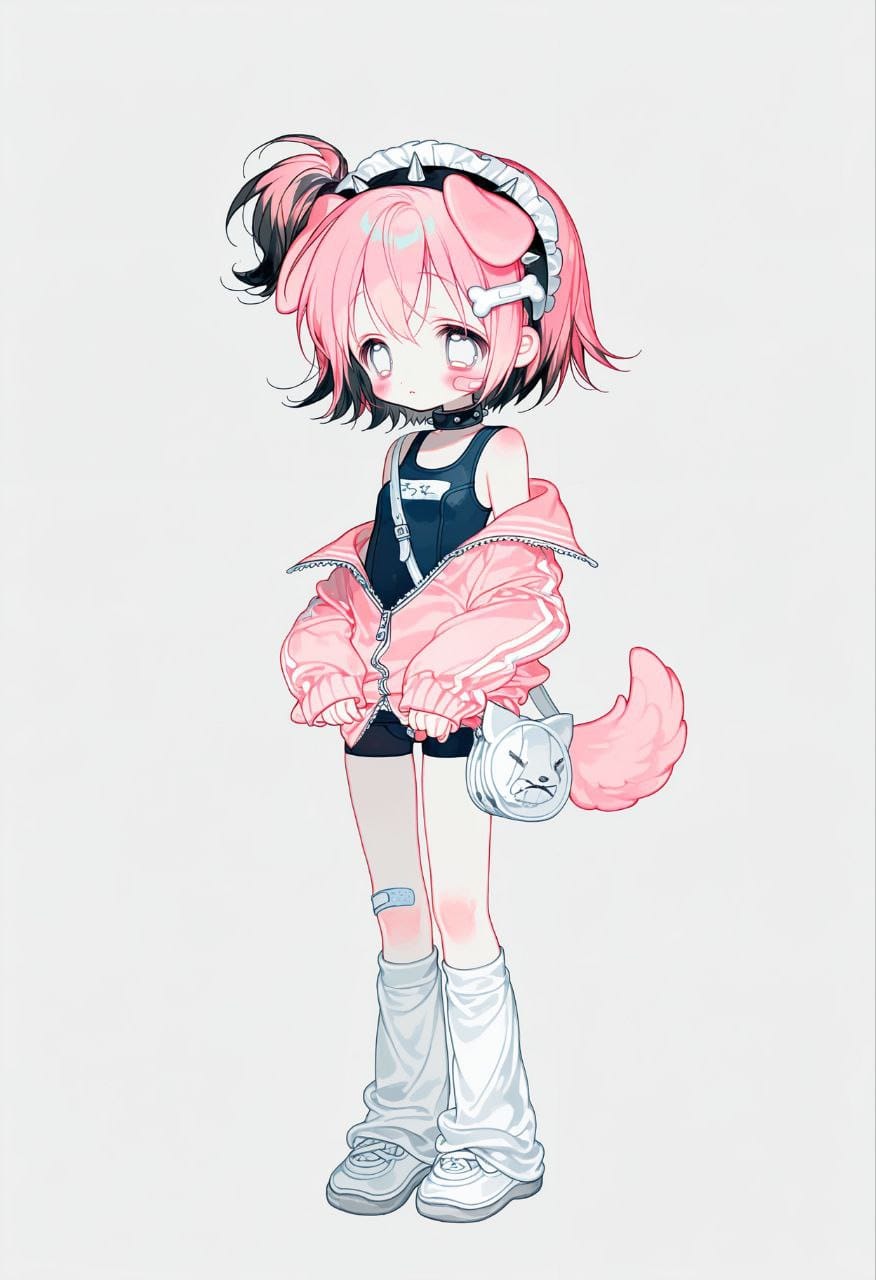 bandaid on face,bandaid on knee,multiple bandaid,black one-piece swimsuit,light pink jacket,jacket partially removed,leg warmers,long sleeves,loose socks,off shoulder,school swimsuit,bike shorts,sleeves past wrists,track jacket,white waist bag,white sneakers,zipper,zipper pull tab