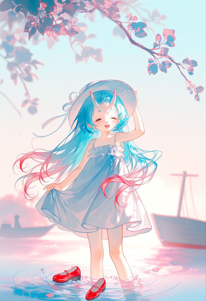 arm up, bare arms, bare shoulders, blurry, boat, branch, depth of field, dress, frilled ribbon, frills, hand on headwear, hand up, hat, hat ribbon, leaf, open mouth, outdoors, red shoes, ribbon, ripples, skirt hold, sleeveless dress, smile, spaghetti strap, standing, summer, sun hat, sundress, teeth, unworn shoes, wading, water, watercraft, white dress, white hat, white ribbon, window