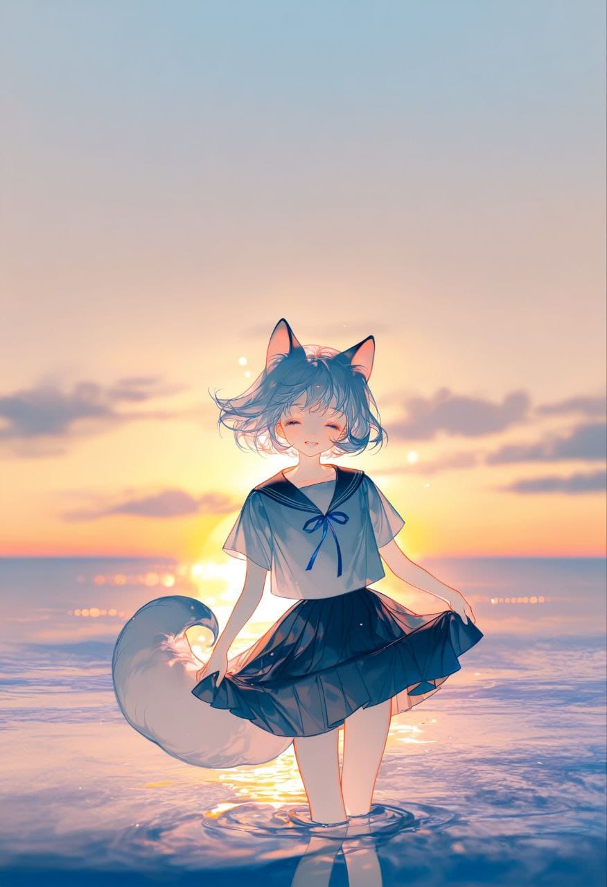 cloud, facing viewer, floating hair, neck ribbon, ocean, outdoors, pleated skirt, ribbon, sailor collar, school uniform, serafuku, shirt, short sleeves, skirt, skirt hold, sky, smile, standing, sun, sunset, wading, water, white shirt