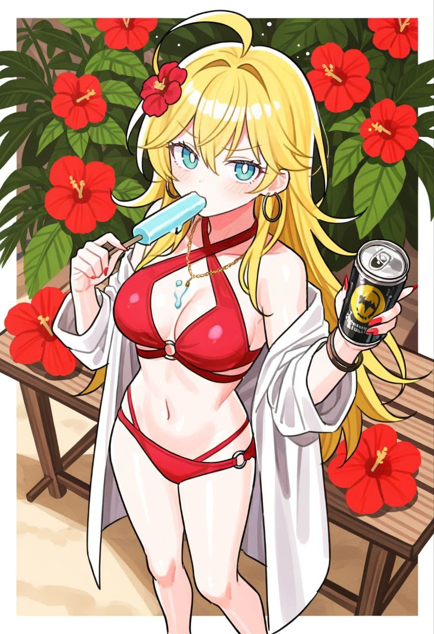1girl, panty (psg), solo, ahoge, bikini, blush, border, breasts, bright pupils, can, chain, chain necklace, criss-cross halter, drink can, earrings, feet out of frame, food, food in mouth, hair between eyes, hair flower, halterneck, heart, holding, holding can, holding popsicle, hoop earrings, huge ahoge, jewelry, long fingernails, long hair, look at viewer, medium breasts, melting, multiple necklaces, nail polish, navel, necklace, o-ring, o-ring bikini, o-ring bottom, off shoulder, open robe, outside border, popsicle, popsicle in mouth, raised eyebrow, red bikini, red flower, red nails, robe, shiny skin, sleeves rolled up, sparkle, standing, star \(symbol\), swimsuit, white border, white robe, from above