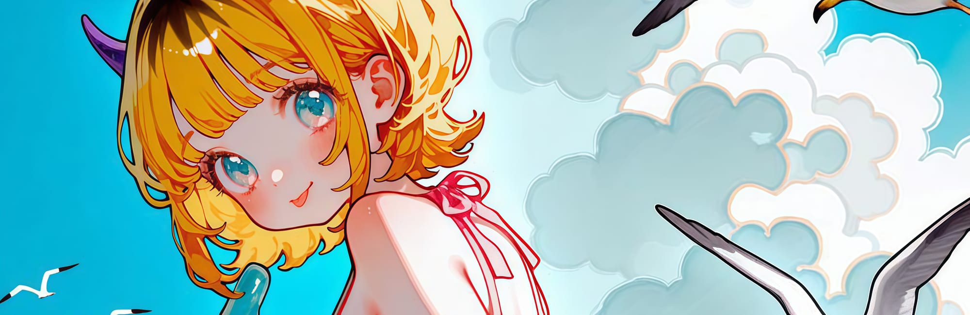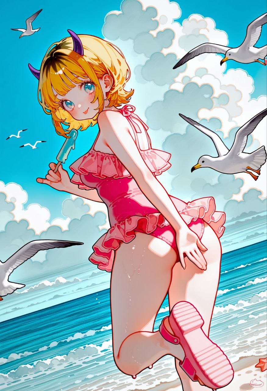 ass, beach, bird, blue sky, cloud, cloudy sky, covering ass, day, dripping, dutch angle, food, from behind, holding, holding food, leg up, looking at viewer, looking back, melting, ocean, outdoors, popsicle, seagull, sky, standing, standing on one leg, summer, water, wet