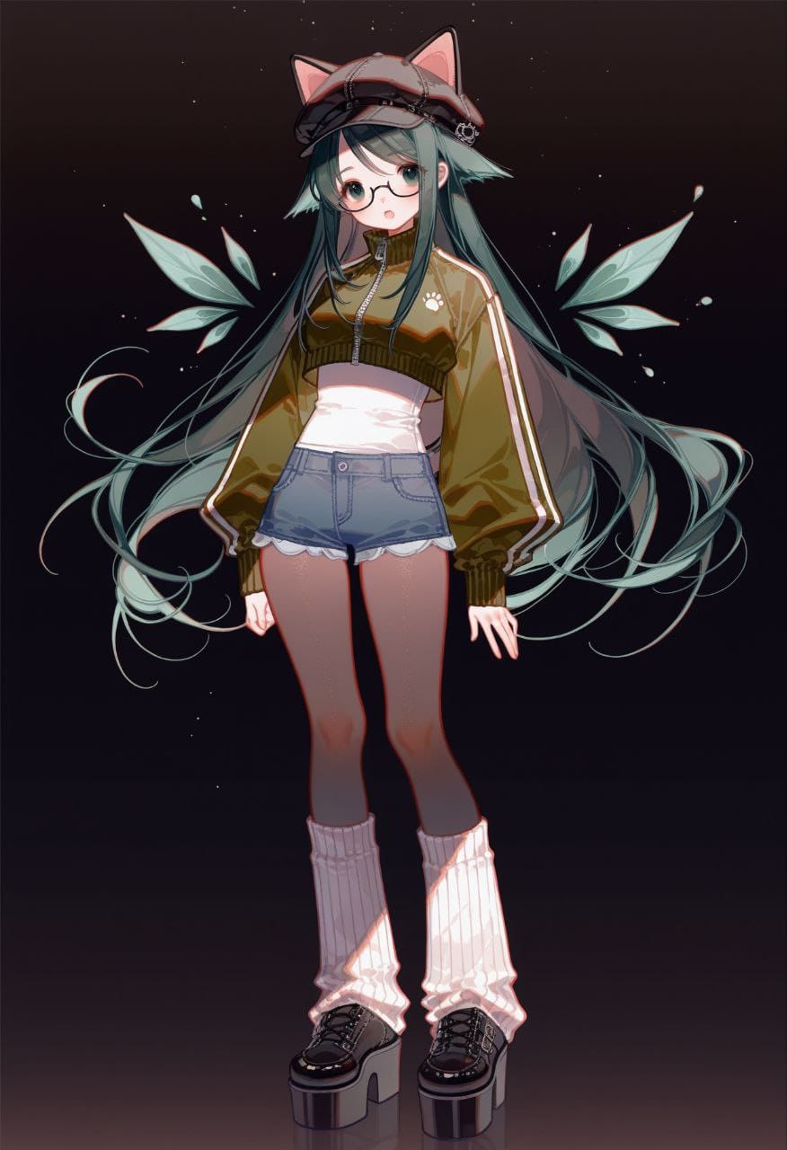 cabbie hat, black hat, animal ears hat, fake cat ears, dark green jacket, (turtleneck jacket:1.2), zipper, long sleeves, cropped jacket, (closed jacket:1.2), track jacket, undershirt, white shirt, short shorts, denim shorts, black pantyhose, white leg warmers, ribbed leg warmers, black footwear, y2k fashion, platform footwear