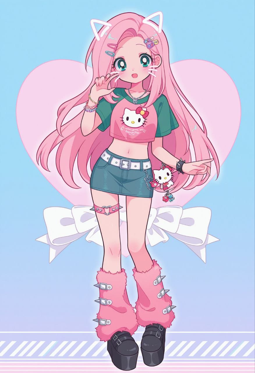 crop top, pink shirt, short sleeves, midriff, navel, print shirt, necklace, bracelets, raglan sleeves, green sleeves, miniskirt, denim skirt, tight skirt, white belt, belt buckle, charm \(object\), thigh strap, spiked strap, pink leg warmers, ((fur leg warmers)), black footwear, platform footwear, y2k fashion, hand bag, hello kitty hairclips, charm attached to belt