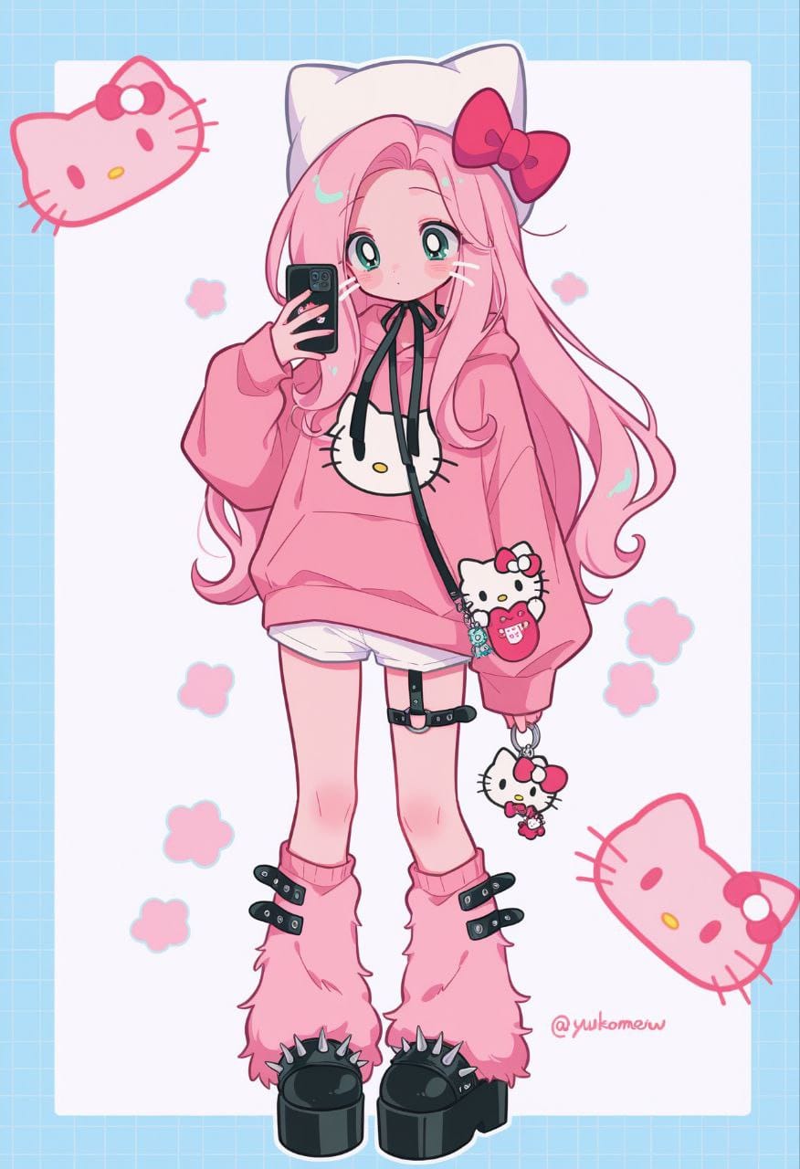 fake cat ears, animal ears headwear, white hat, hat chin straps, long straps, hello kitty hat, oversized shirt, long sleeves, pink hoodie, print shirt, white shorts, short shorts, thighs strap, spiked strap, pink leg warmers, ((fur leg warmers)), black footwear, platform footwear, charm \(object\), hello kitty fashion