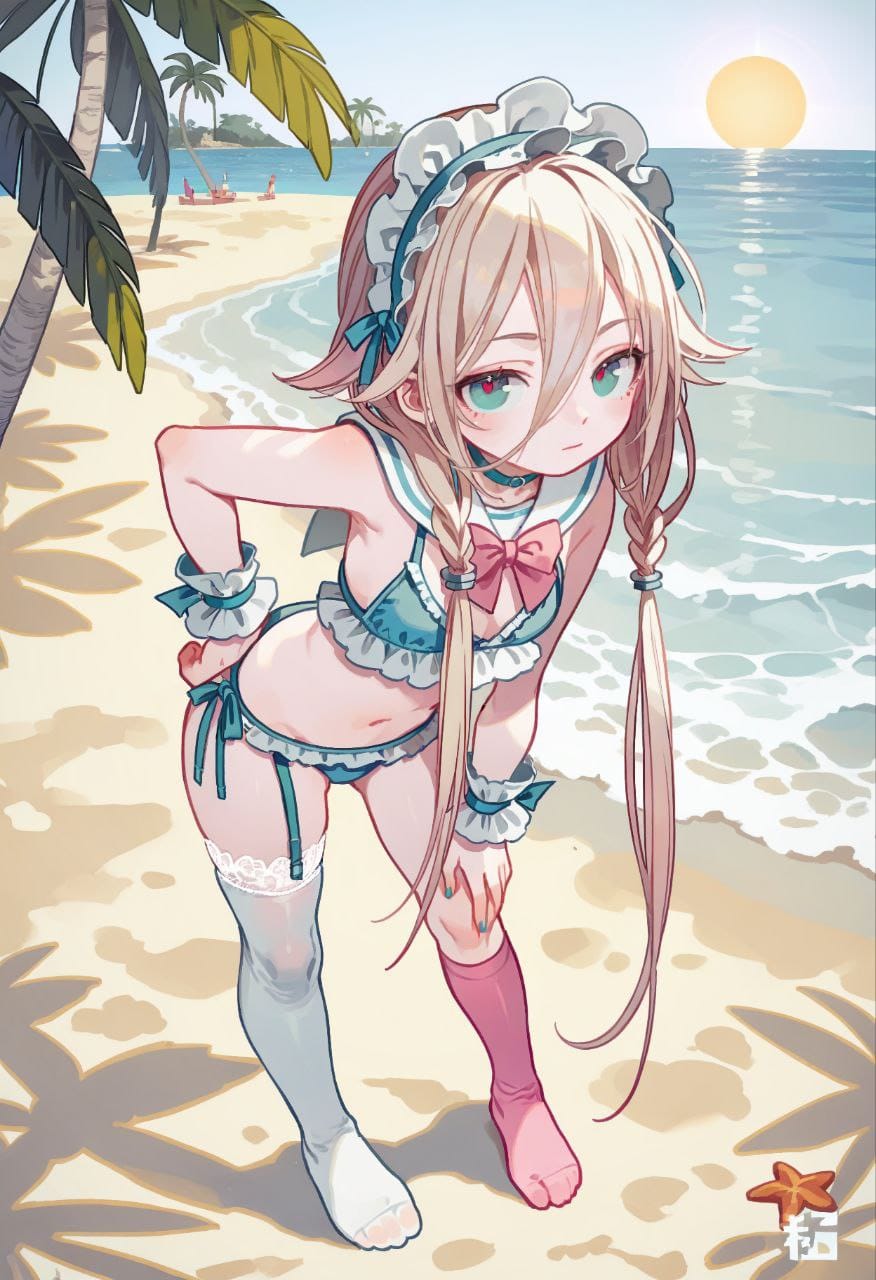 white sailor collar, pink bowtie, bikini, blue bikini, stomach, wrist cuffs, side-tie bikini bottom, frilled bikini, pink pows, lolita hairband, garter strap, uneven legwear, white thighhighs, single thighhigh, lace-trimmed thighhighs, pink kneehighs, single kneehigh, assymetrical legwear, without shoes