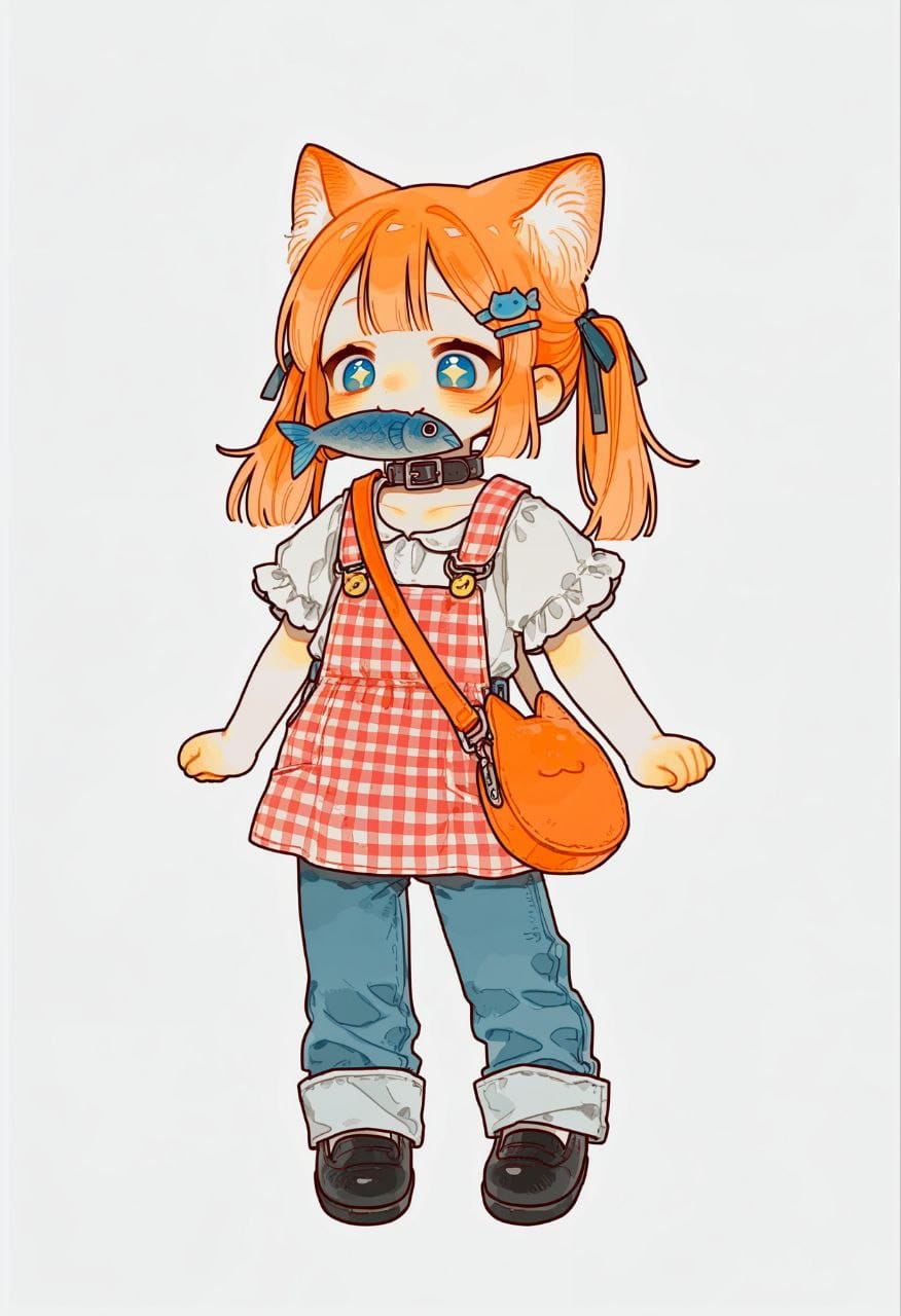 collared shirt, short sleeves, white shirt, frilled sleeves, red overall, white overall, checkered overall, (cropped overall:1.2), overall skirt, denim, jeans, baggy jeans, black footwear, pants under dress, shoulder bag, orange bag