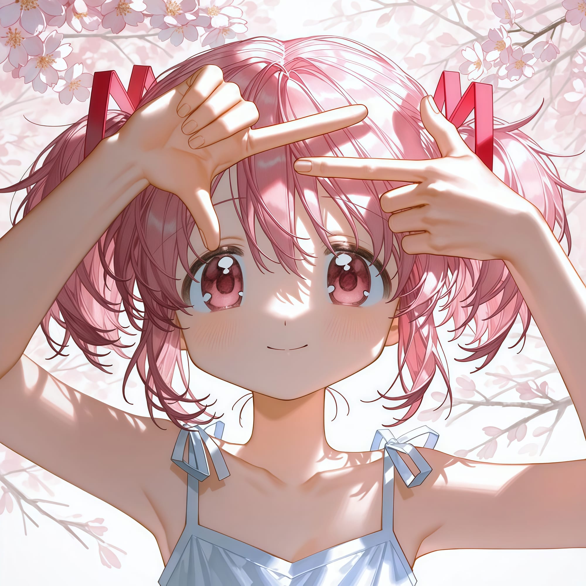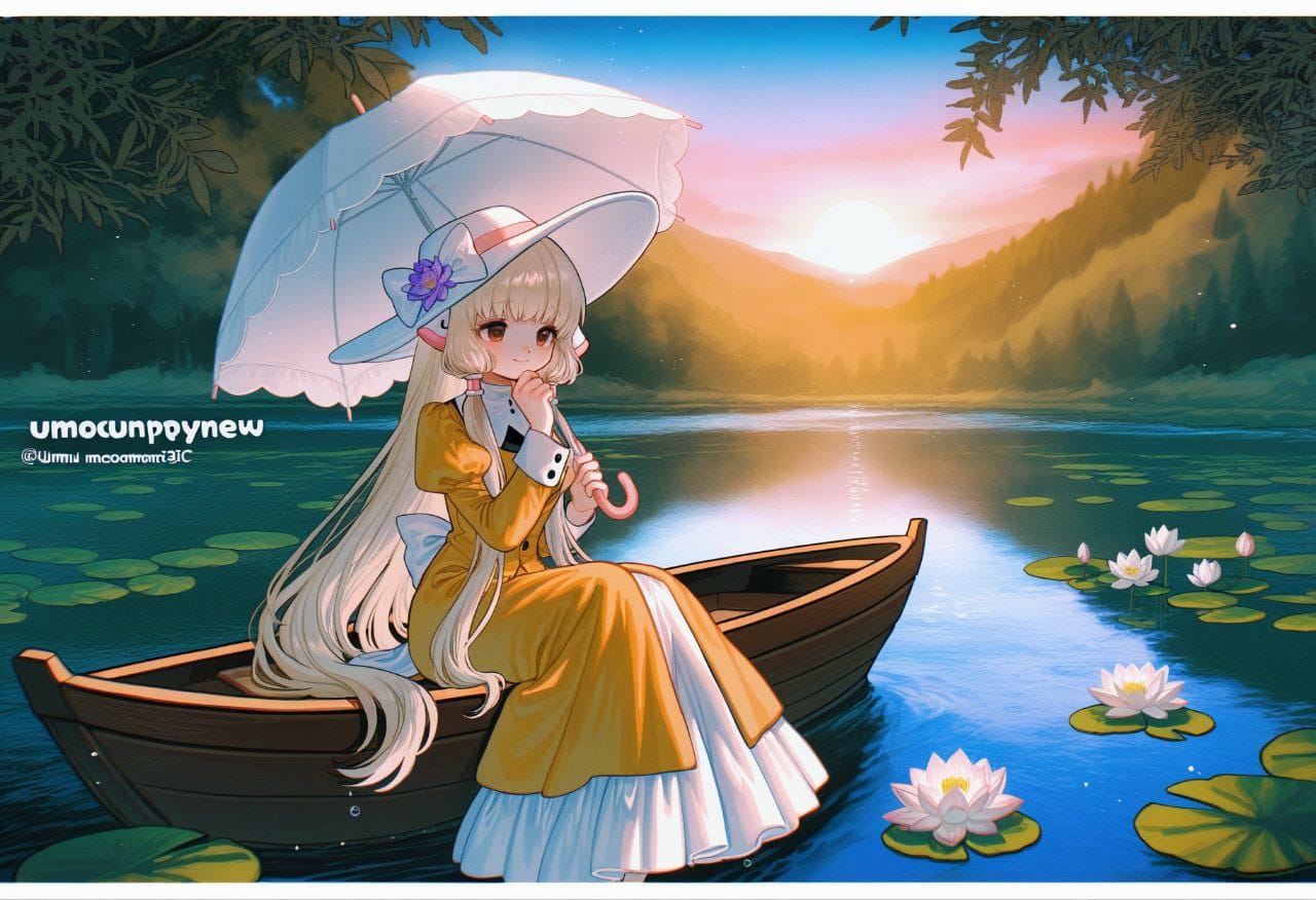 thinking, smile, hand on own chin, closed mouth, white umbrella, parasol, holding, holding umbrella, boat, flower, letterboxed, light particles, lily pad, lotus, outdoors, picture frame, river, scenery, sitting, sunrise, tree, umbrella, watercraft, white flower, water