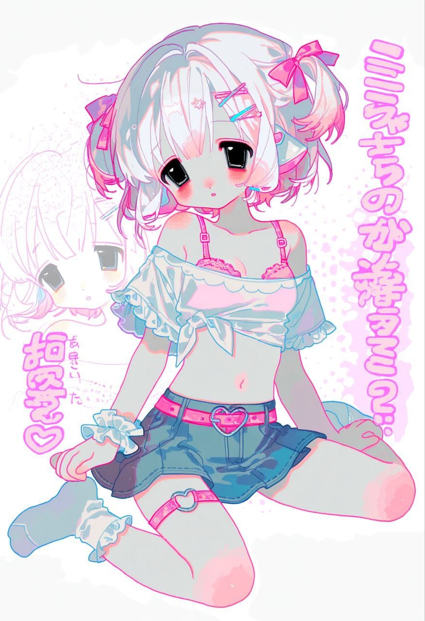 bare shoulders, crop top, midriff, miniskirt, navel, off shoulder shirt, denim skirt, pleated skirt, heart o-ring thigh strap, pink belt, heart belt, frilled wrist cuffs, bobby socks, white shirt, short sleeves, frilled sleeves, pink bra, (bra under shirt), tied shirt