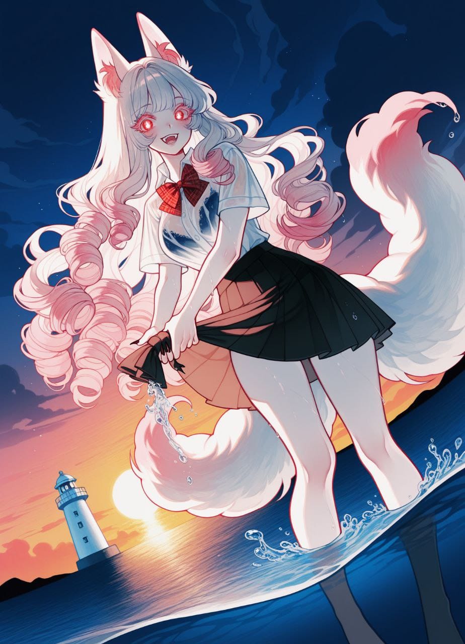 from below, dutch angle, looking at viewer, smile, open mouth, standing, water, wading, wet skirt, wringing clothes