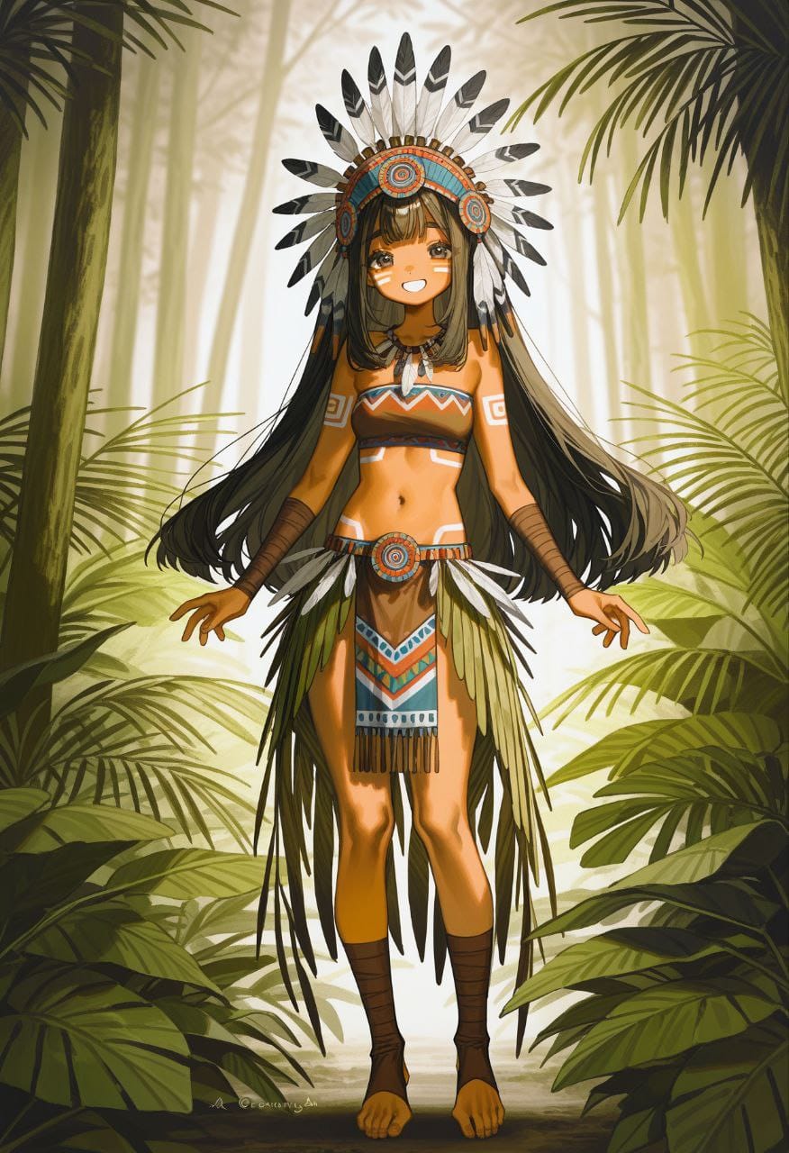 brown ankle wrap, brown bandages, bandeau, barefoot, white facepaint, white face mark, white tattoo, midriff, brown pelvic curtain, stirrup legwear, feathers headdress, tribal print, leaf skirt, toeless legwear, tribal costume, tube top, aztec print, feather necklace