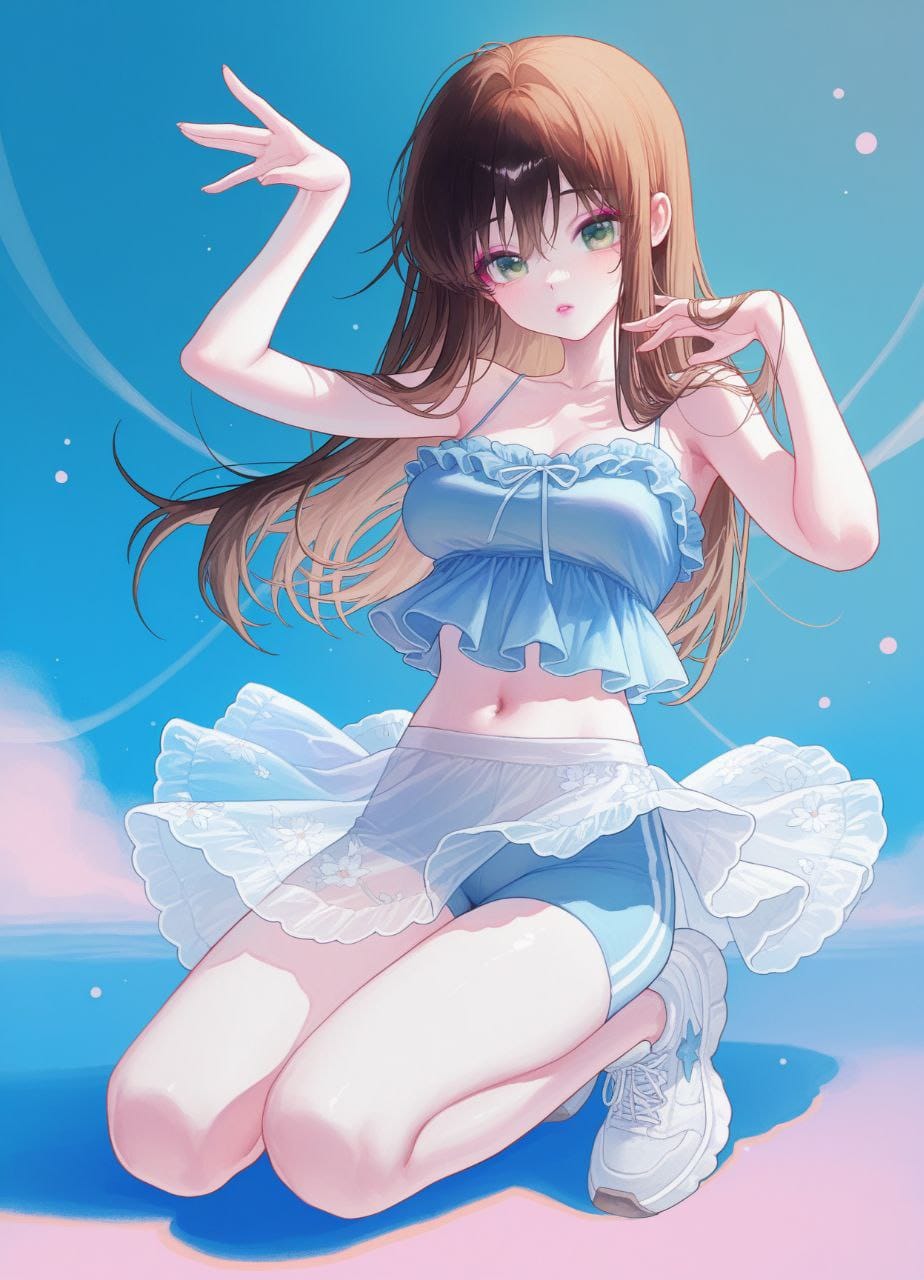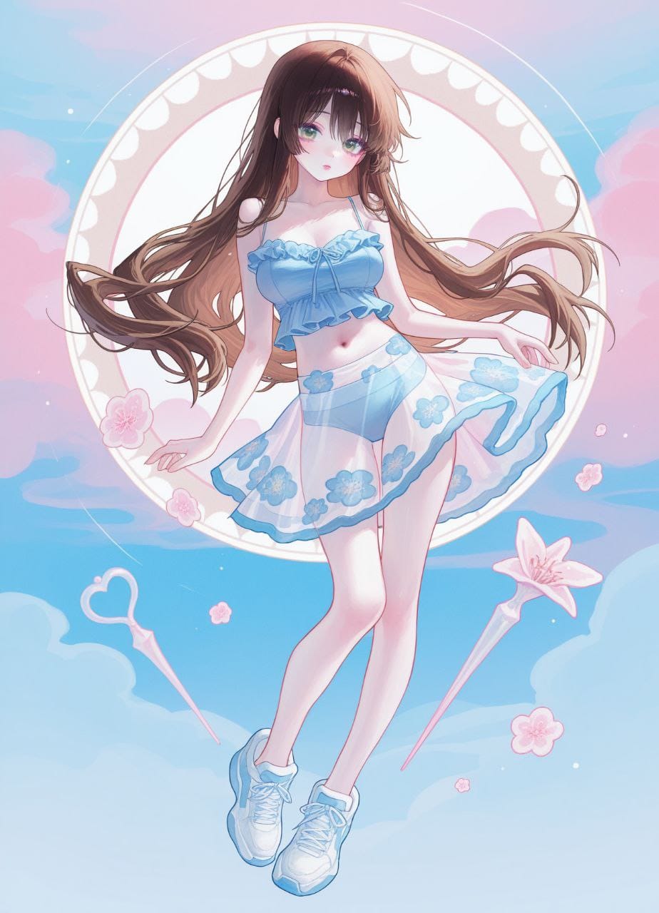 navel, midriff, (blue camisole, blue frills, transparent frills, white frills, spaghetti strap), sleeveless, blue sports shorts, floral print on skirt, white skirt, see-through skirt, knee skirt, white sneakers