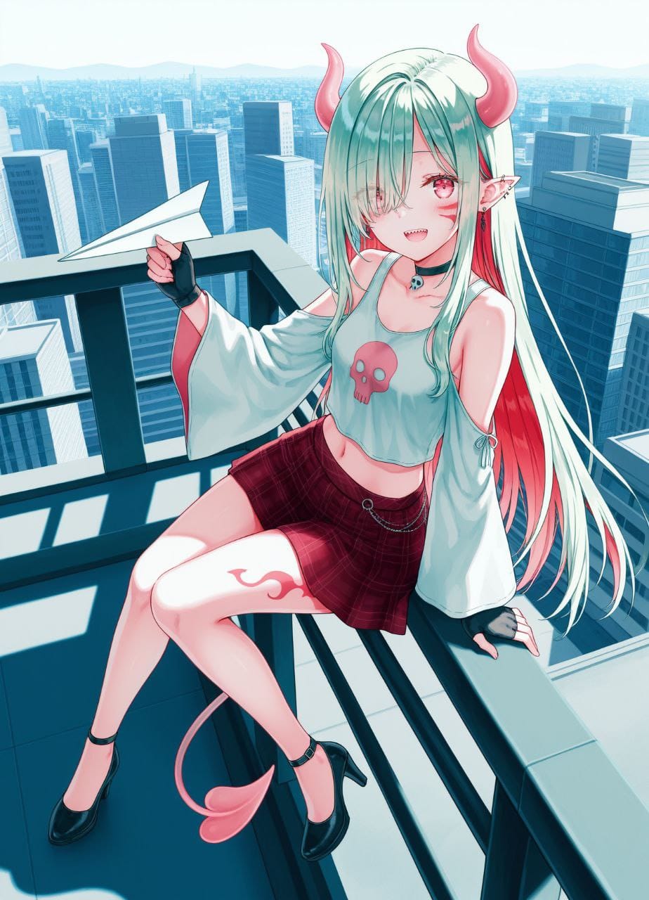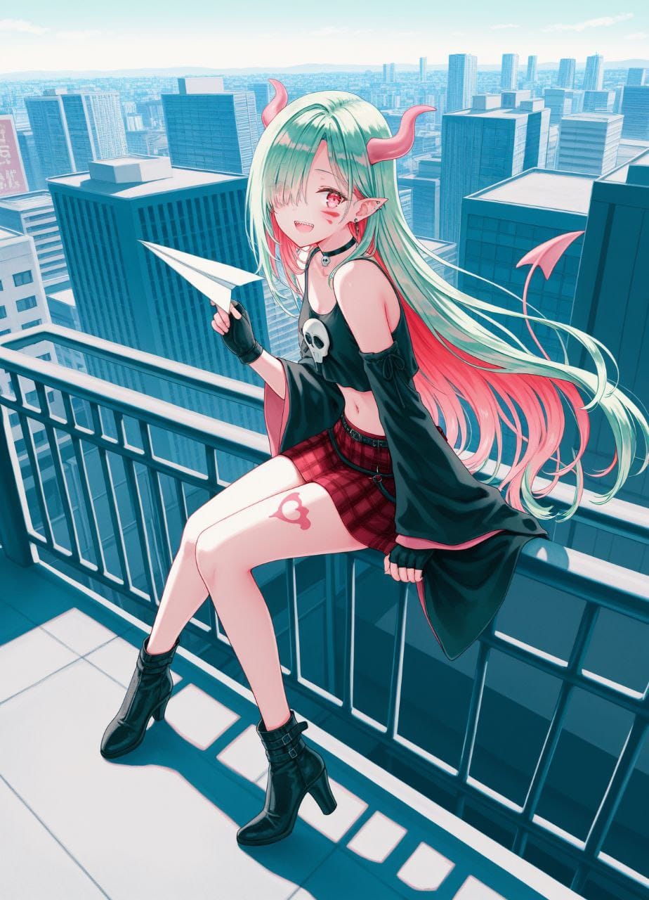 looking at viewer, hand on railing, holding paper airplane, sitting on railing