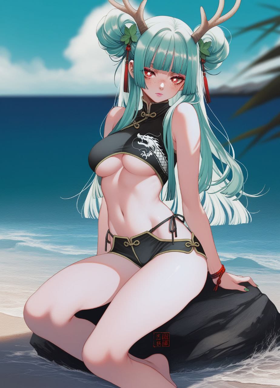 white dragon print, chinese style, bikini bottom only, black bikini, black tank top, breasts, crop top, sleeveless, black micro shorts, side-tie bikini bottom, stomach, swimsuit, rope bracelets, underboob cutout, sleeveless turtleneck, hip vent