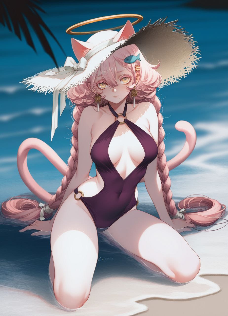 breasts apart, casual one-piece swimsuit, o-ring, o-ring swimsuit, hip vent, dark purple one-piece swimsuit, straw hat, white hat ribbon, swimsuit, bare shoulders, covered navel, halterneck