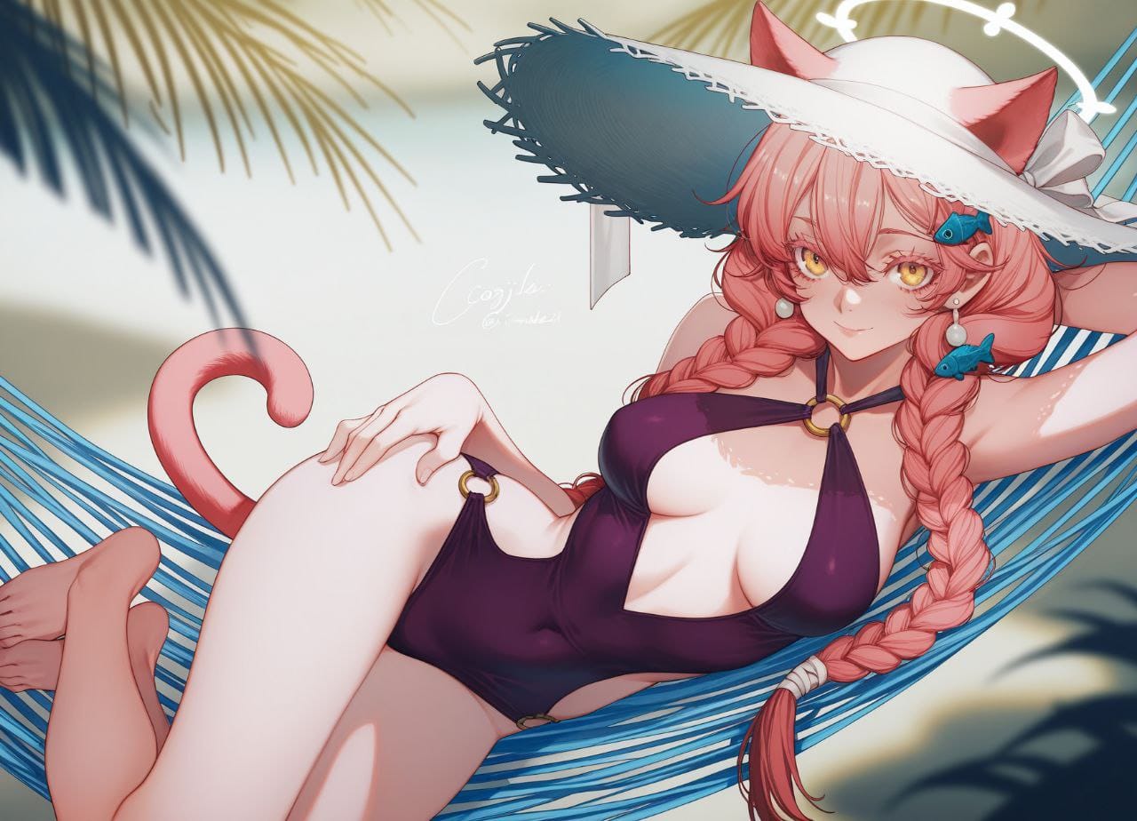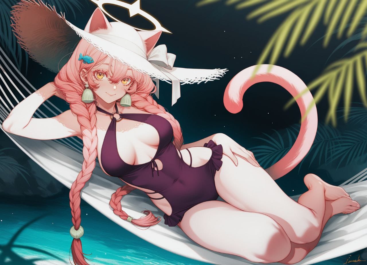 1girl, lying in a hammock, arm behind head, looking at viewer, smile, lying on side, top view, feet together, close up, hand on hip