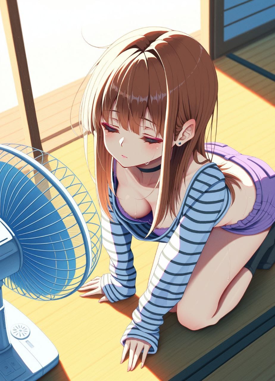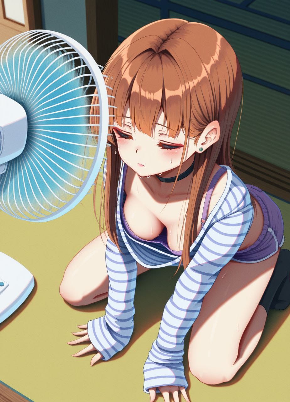 from afar, full body, blush, all fours, closed eyes, closed mouth, electric fan, indoors, kneeling, from above, head up, wind, spread hair, emotionless, sweat, fanning self, facing the fan, arms on floor, on floor