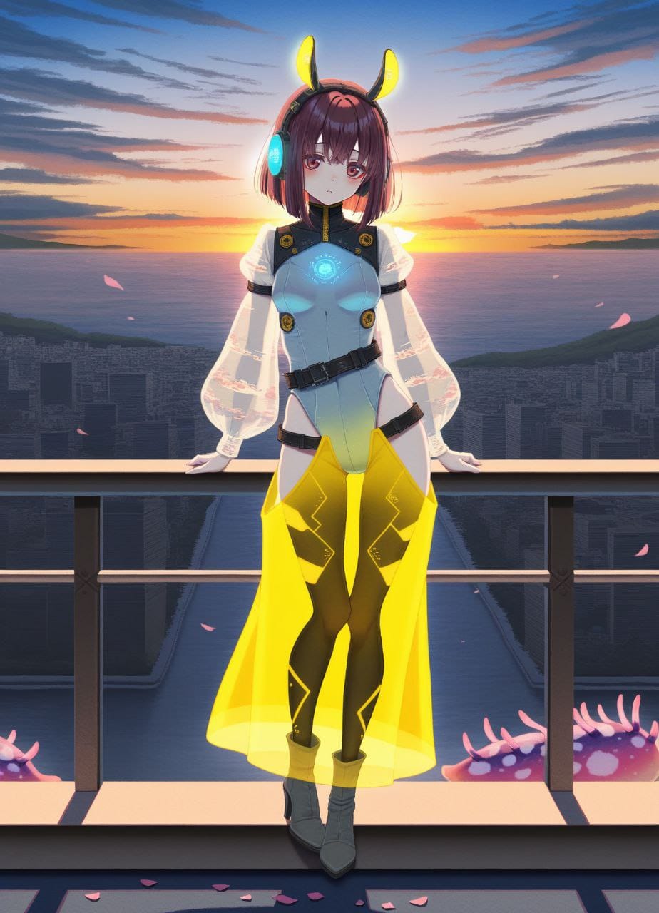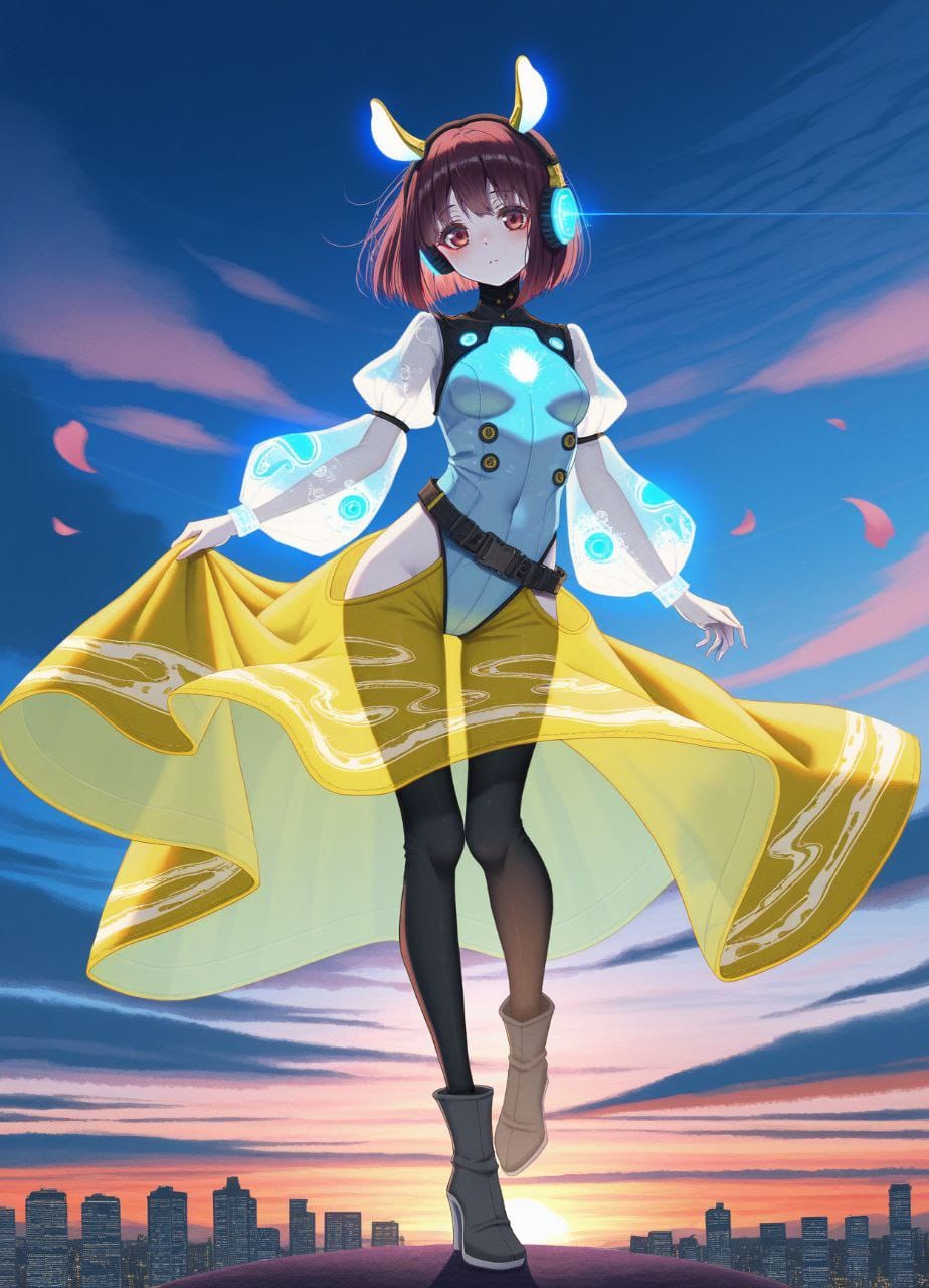 mechanical accessories, bodysuit, many dark belts, contrapposto, grey animal ear headphones, fake animal ears, headgear, highleg leotard, (sea slug ears:1.2), mechanical ears, white sleeves, see-through sleeves, (pale blue leotard), turtleneck, electric print, wave print, long puffy sleeves, see-through skirt, long skirt, yellow skirt, glowing print, dark grey boots, high heel boots, blue glowing elements, cyberpunk style, black pantyhose, buttons, long skirt, hip vent