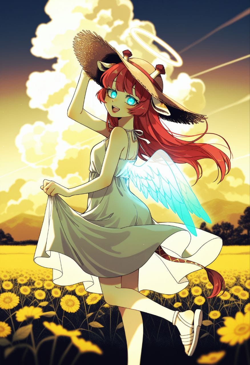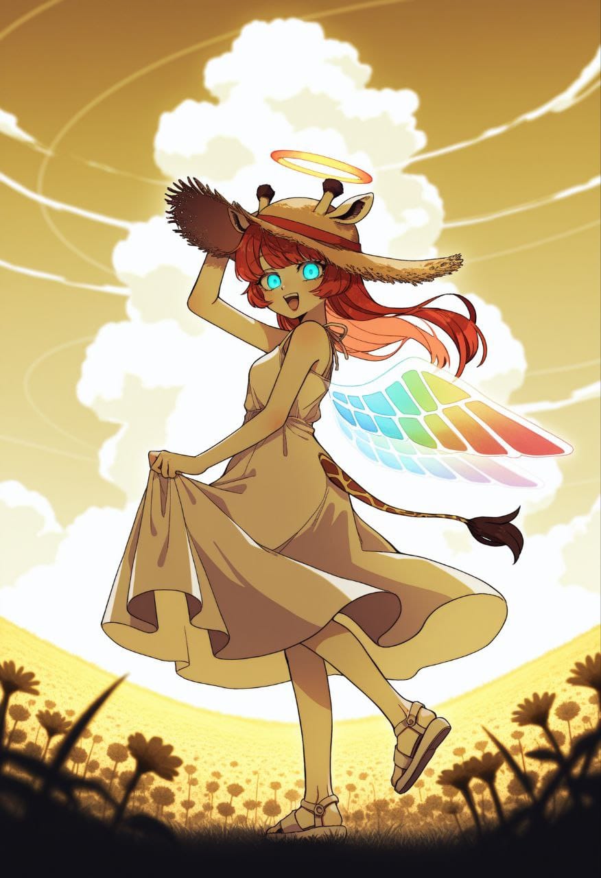 twisted torso, standing on one leg, smile, open mouth, looking back, looking at viewer, hand on headwear, from side, floating hair, leg up, dress hold