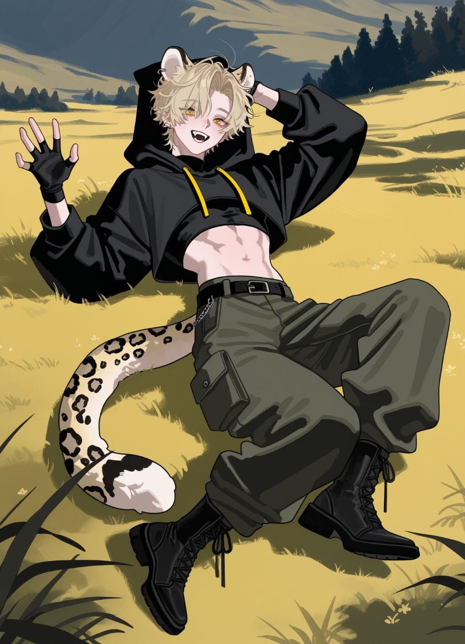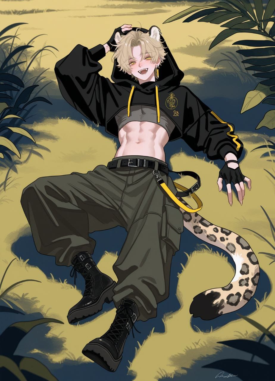 jewelry, baggy pants, black gloves, fingerless gloves, black hoodie, dark green cargo pants, dark grey crop top, cropped hoodie, yellow drawstrings, hood up, midriff, navel, shrug \(clothing\), long sleeves, black belt, black high boots, pockets