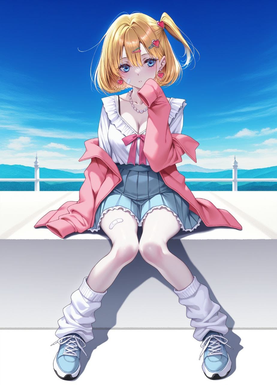 asymmetrical legwear, white bandaid on face, white bandaid on leg, bead necklace, pale blue skirt, cleavage, collarbone, heart earrings, frilled skirt, frills, hairclip, heart hair ornament, pink jacket, jewelry, leg warmers, long sleeves, loose socks, miniskirt, off shoulder, one side up, pink bow, pale blue footwear, pink ribbon, pleated skirt, white shirt, sneakers, sleeves past fingers, sleeves past wrists, white socks