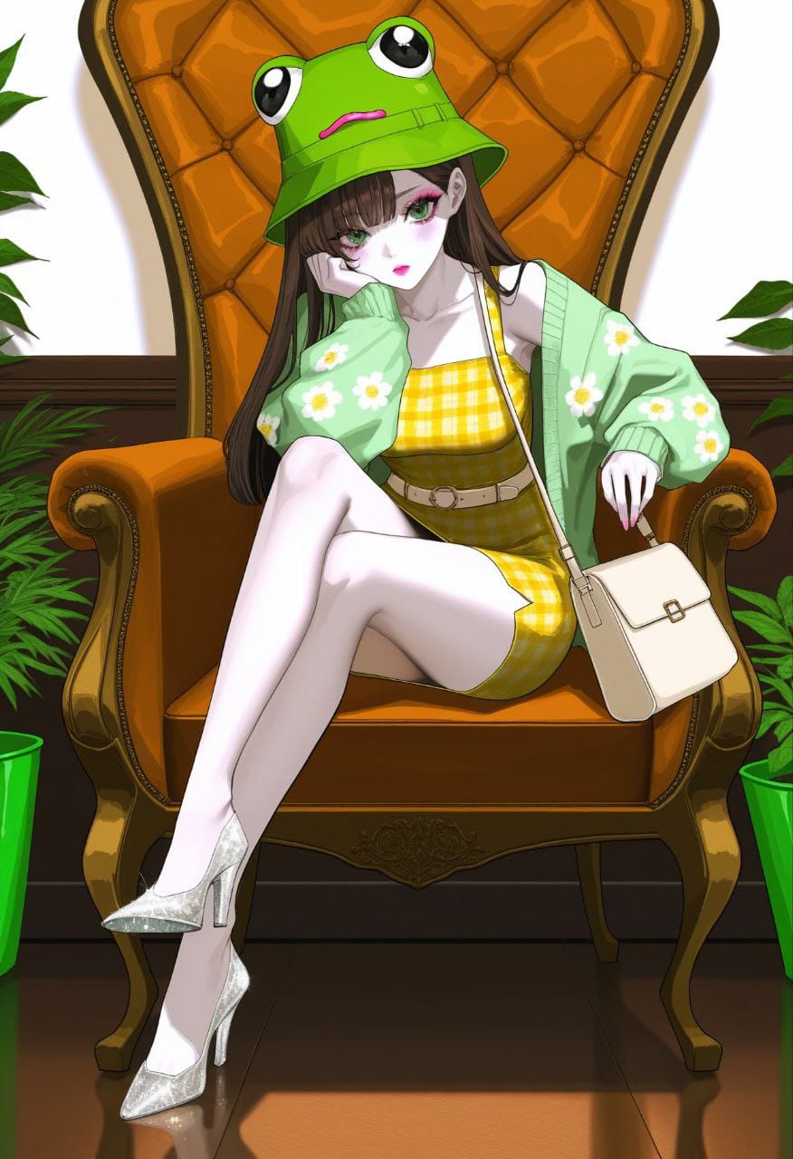 collarbones, green sweater, pale green cardigan, floral print (cardigan), long sleeves, yellow dress, plaid dress, pencil skirt, beige belt, green bucket hat, frog hat, white high heels, glitter shoes, beige bag, bare legs, beige shoulder bag, open cardigan