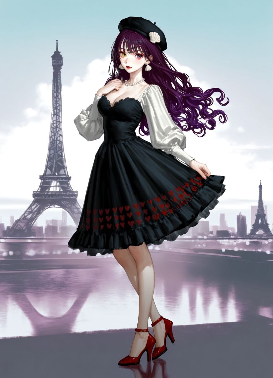 cleavage, black beret, heart print on dress, shell accessories, (shell on beret:1.2), pearl necklace, shell earrings, jewelry, black dress, high heels, long sleeves, puffy sleeves, red footwear, shoes, sleeveless dress, white shirt, frills, (a line dress, shemiz dress:1.2)