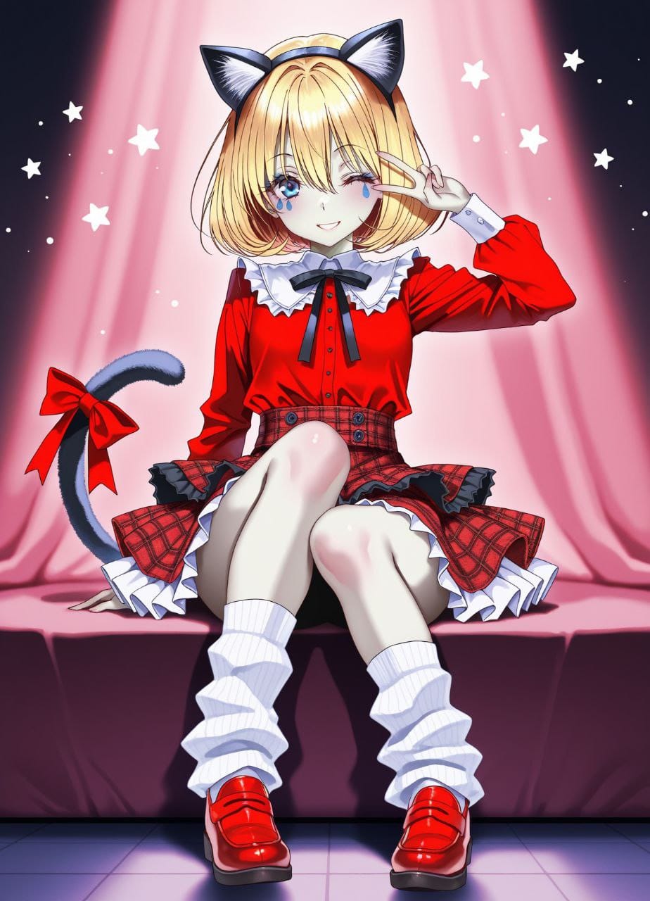 frilled skirt, frills, fake cat ears, fake cat tail, hairband, layered skirt, long sleeves, loose socks, plaid skirt, black bow, red footwear, red ribbon, red shirt, red skirt, shoes, tail bow, tail ornament, tail ribbon, white socks, white blouse