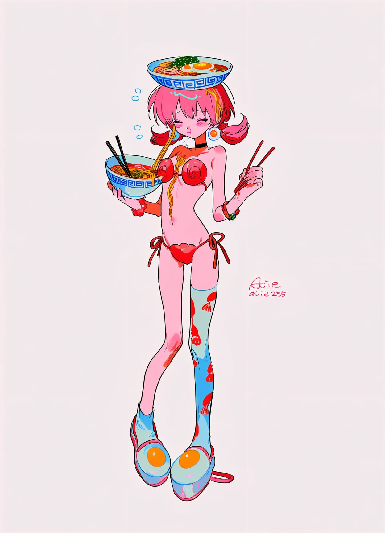 ramen humanization,((egg bra)),(noodles on body:1.1),navel,noodles,swimsuit,single thighhigh,side-tie bikini bottom,red straps,((macaroni bikini)),asymmetrical legwear,spice print,sandals, high platform,egg shoes,((macaroni stockings))