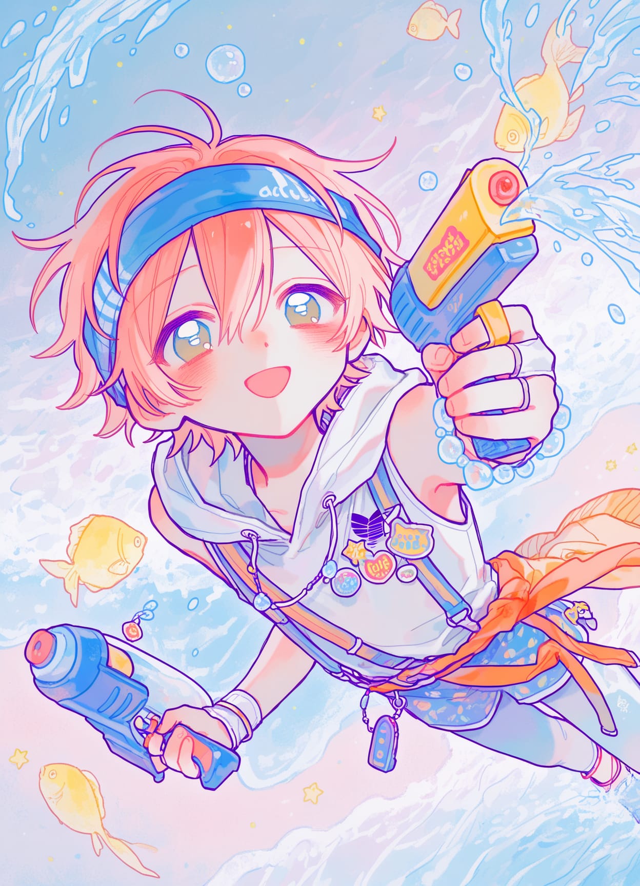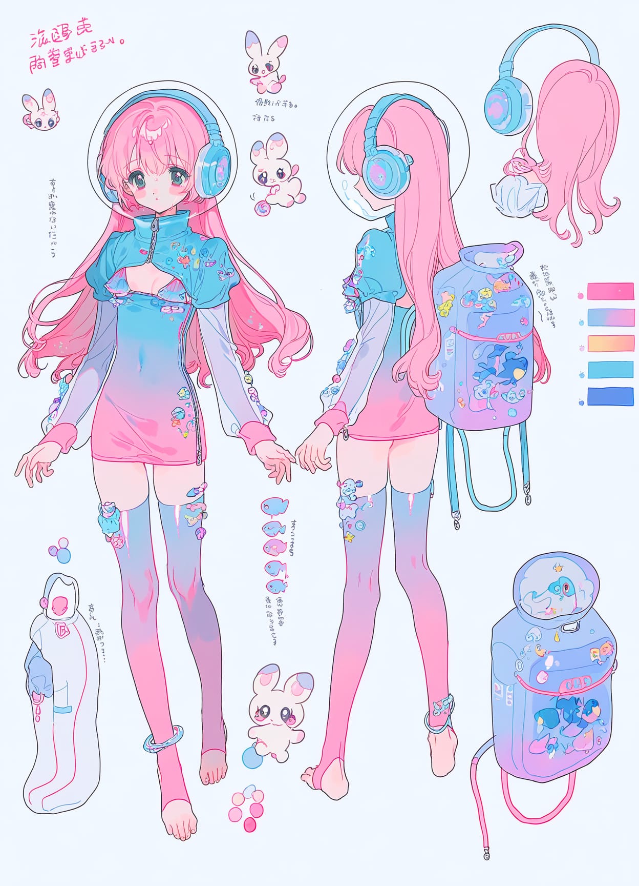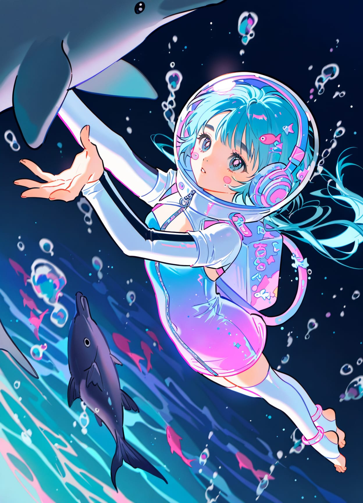 (space decora),((large headphones)),anklet,sports wristbands,diving backpack,glass helmet,aquarium in head,fish in head